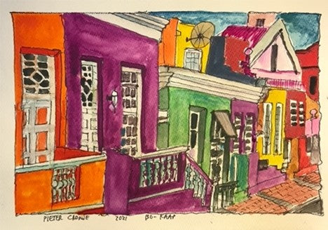 Get lost in the vibrant colours and intricate details of Bo-Kaap 15 2021, a stunning watercolour painting by Pieter Cronje. Capturing the unique cityscape of Bo-Kaap, this piece adds a touch of culture and beauty to any space. With expert brushstrokes and vivid imagery, this painting is a must-have for any art lover.