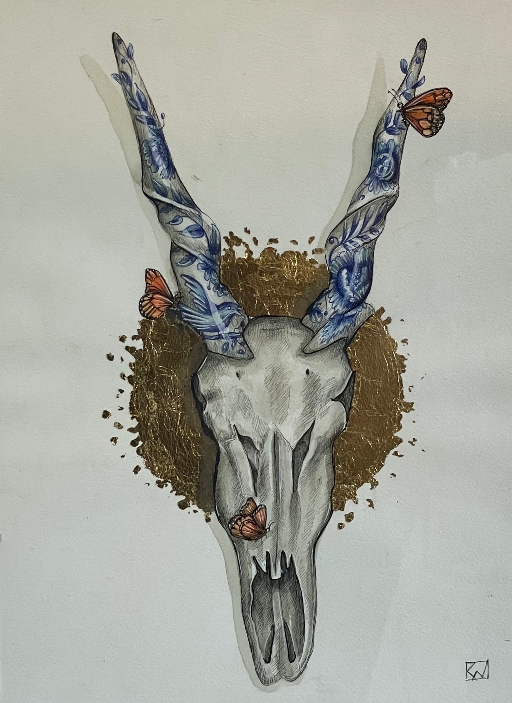 This stunning piece by renowned artist Karien van Wyk showcases a unique blend of mixed media, highlighting a beautiful eland skull adorned with exquisite delft horns and intricate butterflies. Ideal for art collectors looking for a captivating and exclusive addition to their collection.