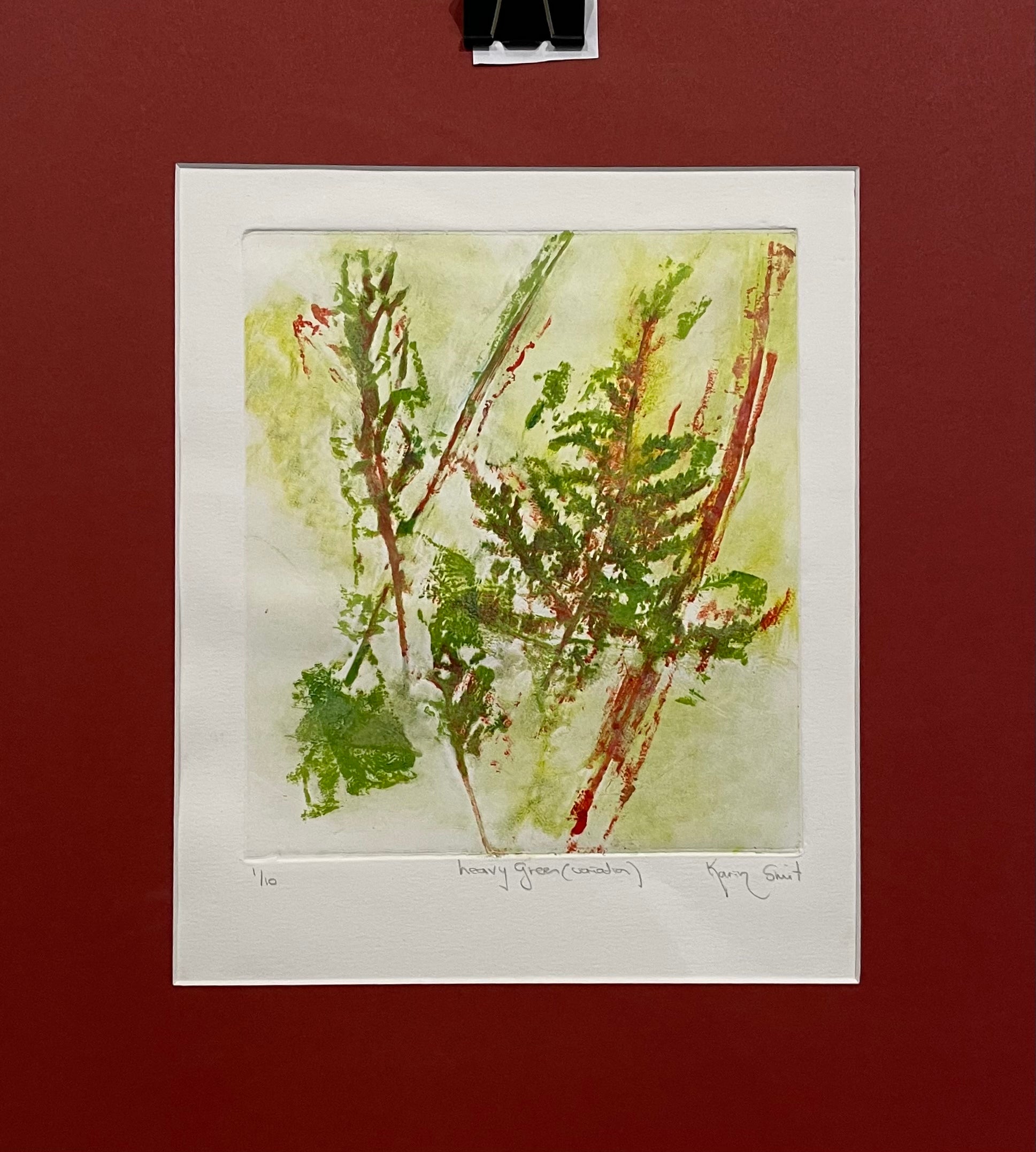 Grow your artistic bravery with this stunning collagraph print of leaves by Karin Smit. Add a touch of nature to your home and embrace the beauty of taking risks with this vibrant leafy green variant. Dare to be bold and bring a sense of adventure to your decor.
