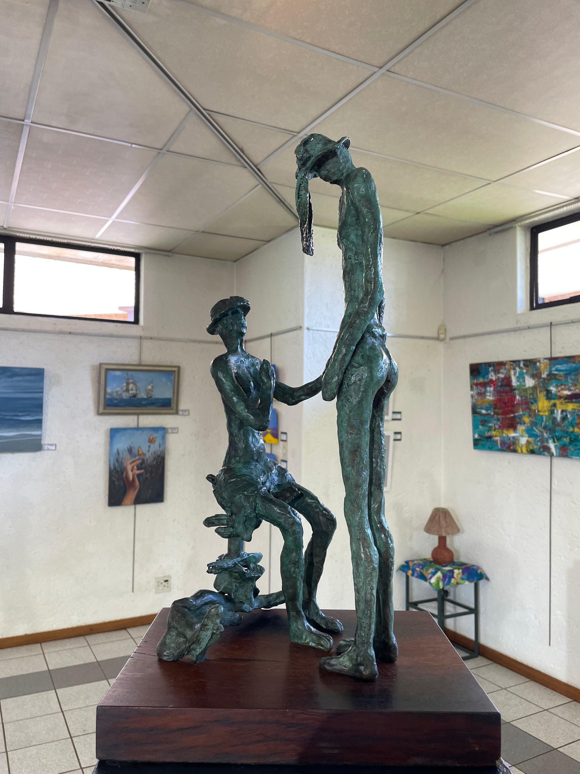 Indulge in the exquisite Conversazioni 2/9 2018 bronze sculpture by Stephanie Bester. Two figures, adorned with a veil and a hat, intimately engage in conversation while holding hands. This captivating piece, part of an exclusive edition of 9, will enhance any space with its elegant and thought-provoking presence.