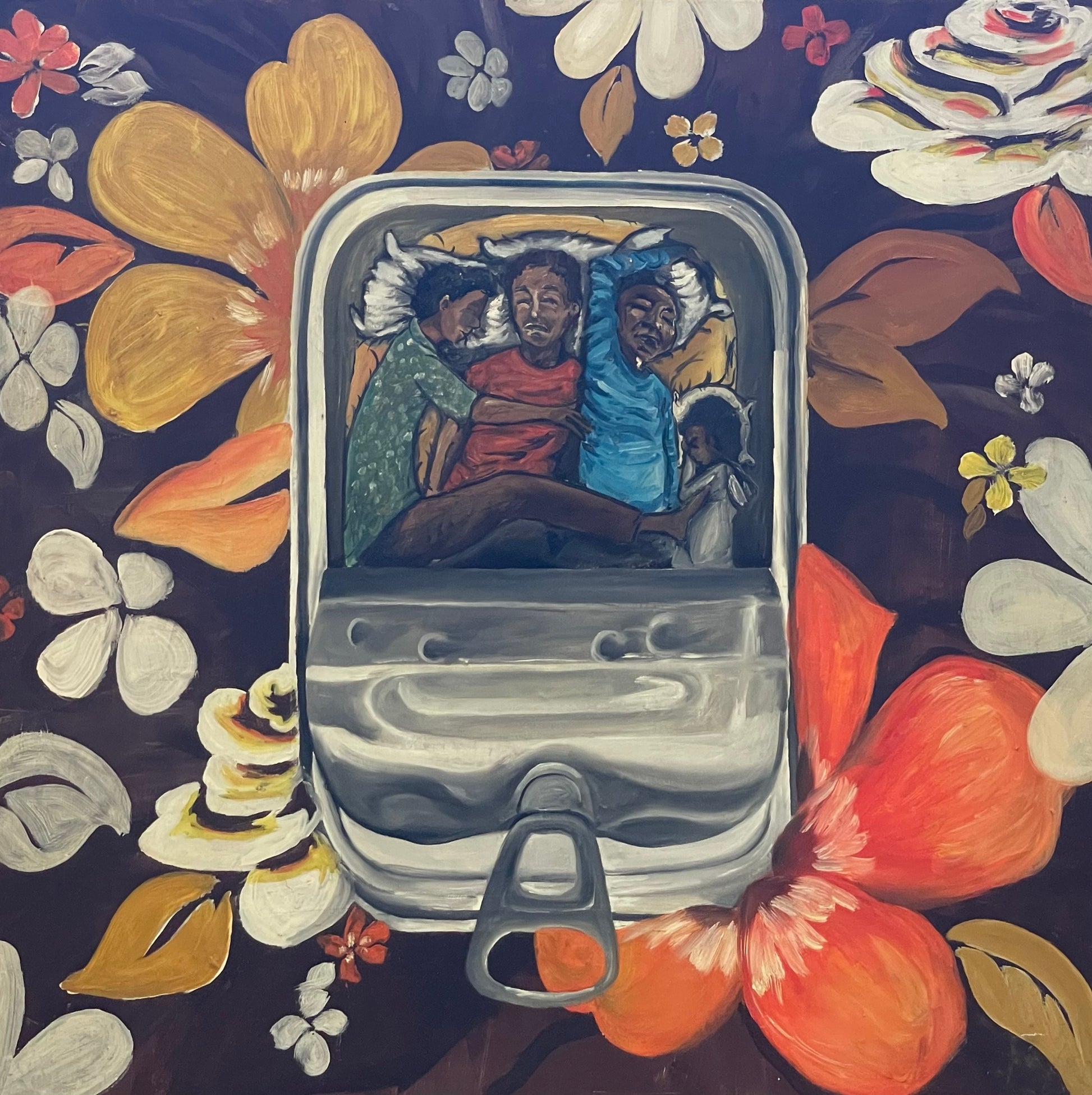 This expertly crafted acrylic painting by Michaelangelo Abrahams captures a family of four cozily nestled in a sardine tin against a vibrant floral backdrop. A whimsical and unique addition to any art collection.