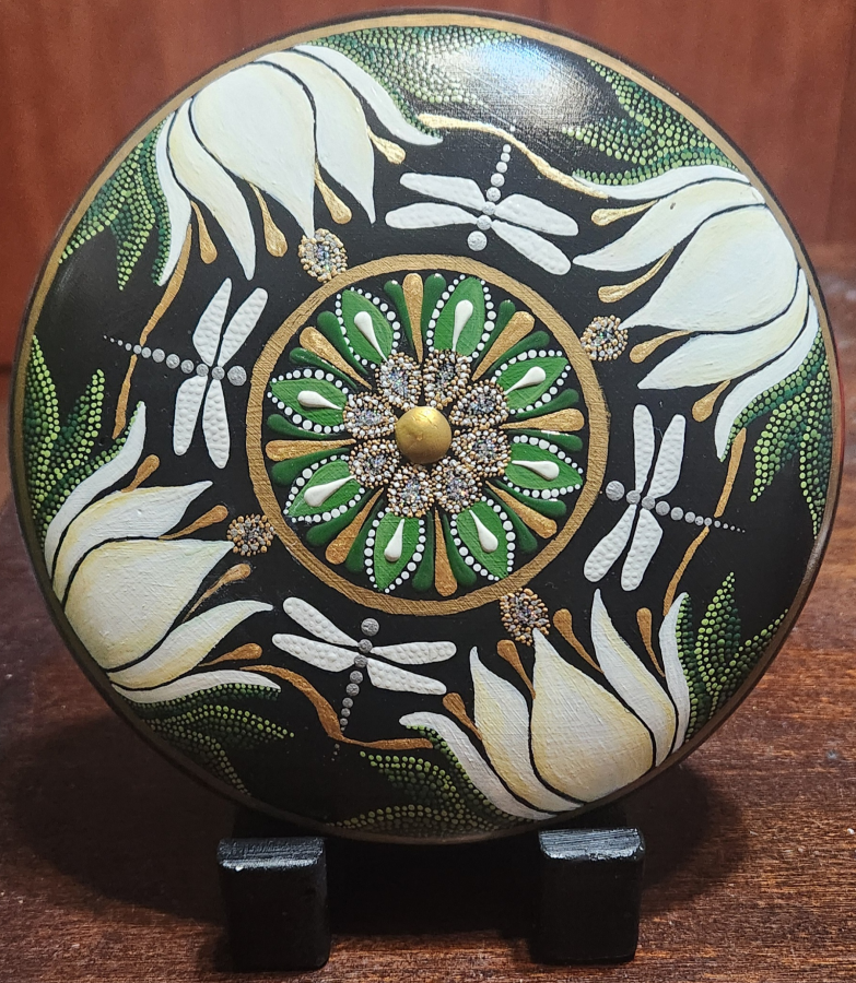 This 18cm round ornament is made of casting stone and a perfect handmade gift and ornament. The floral dot art design will uplift any mood and makes a wonderful addition to any home.