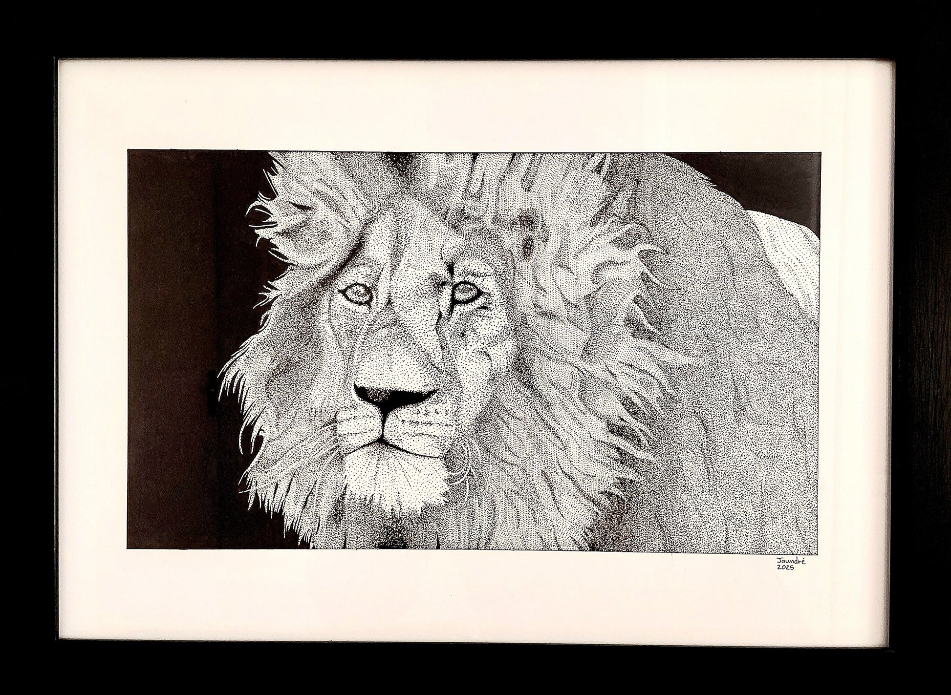 Lion is a pointillism drawing of one of South Africa’s most celebrated icons. This majestic animal could be regarded as the fiercest of South Africa’s big five. Symbolizing strength, courage, nobility, and royalty, a group of lions is known, quite fittingly, as a pride. Historically, the lion has been regarded as the king of beasts. Who wouldn’t be proud having this magnificent creature associated with one’s own country and identity?