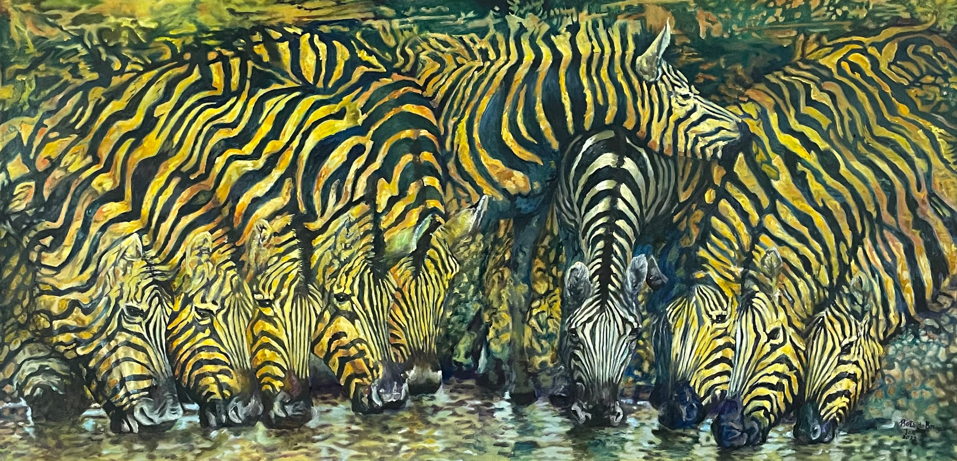 Experience the stunning perspective of a lion watching a dazzle of zebras drinking from a watering hole, captured in this oil painting by Bets de Bruyn. With precise brush strokes, this piece showcases the intricate beauty of these animals in their natural habitat. Add a touch of the wild to any room.