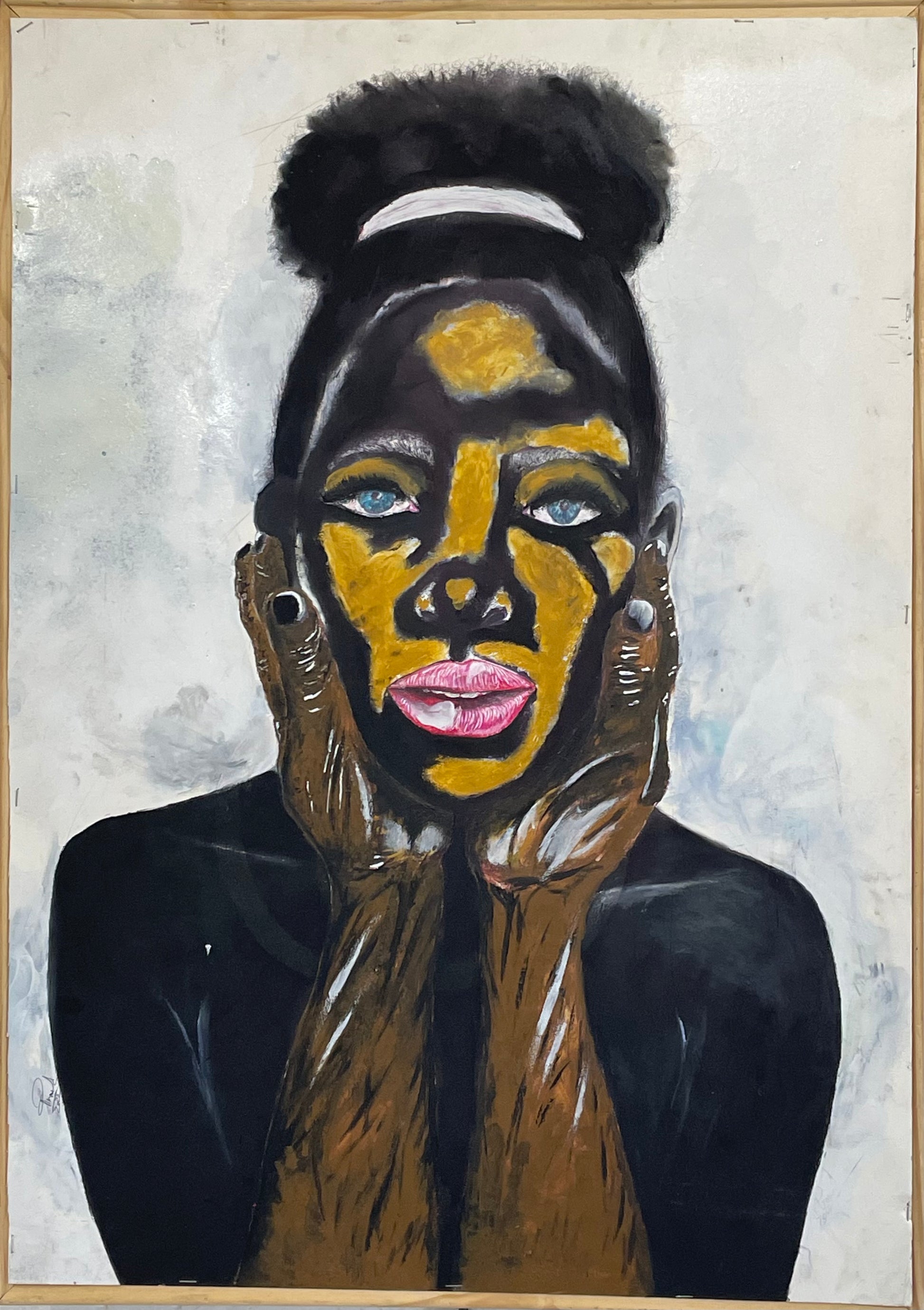 Experience the emotional power of this stunning acrylic portrait by Proud Makgoka. Featuring a scared woman, hands clasped in fear, and bold pink lipstick, this piece captures the essence of love- raw, vulnerable, and unapologetic. Add it to your collection and feel the intensity of passion and emotion every day.