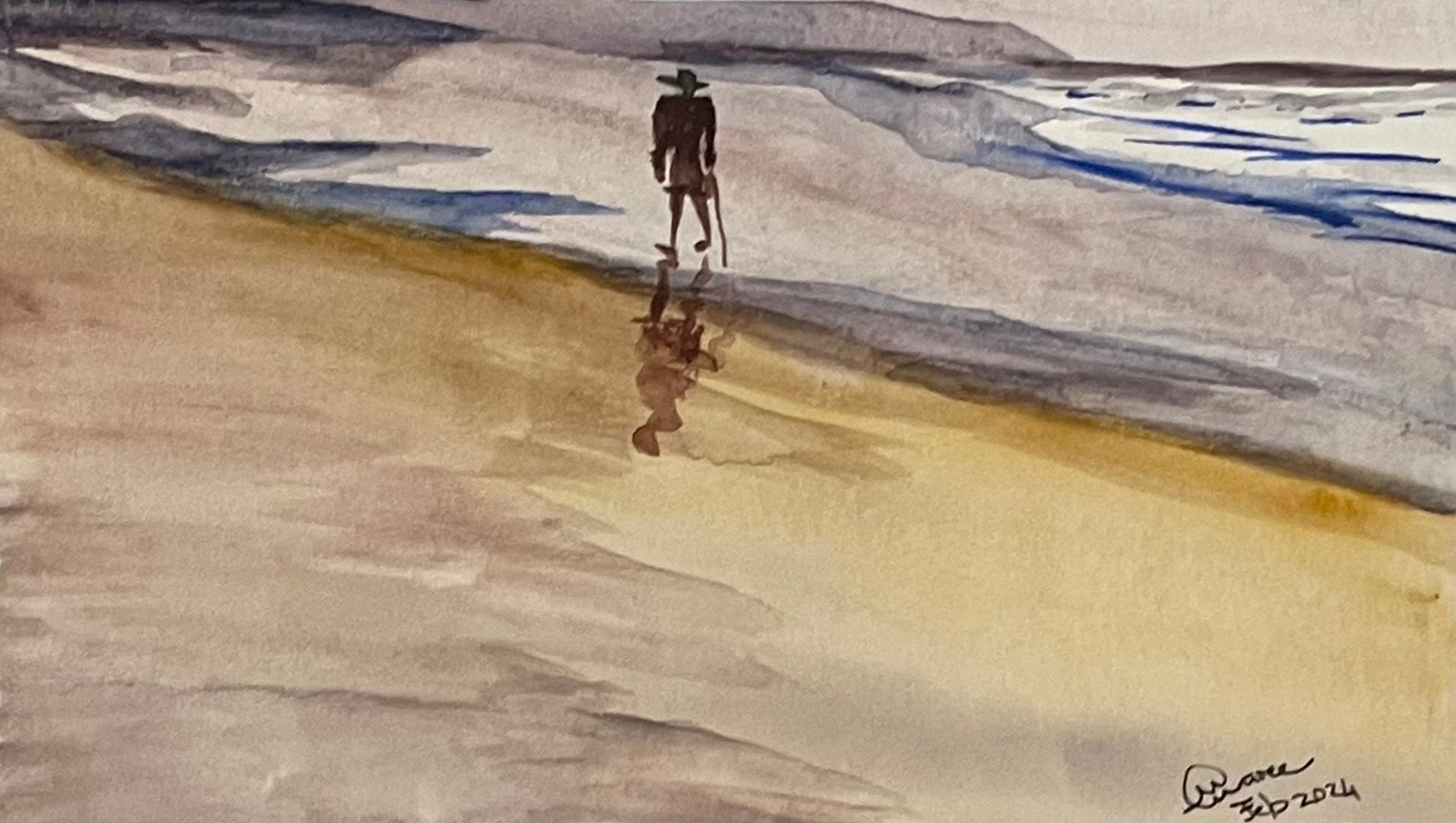 Experience the tranquility of the ocean with our exquisite watercolor painting, featuring a solitary figure on a deserted beach. MC Maree's unique style captures the beauty and serenity of this coastal scene. Add a touch of sophistication and luxury to your space with this exclusive piece.