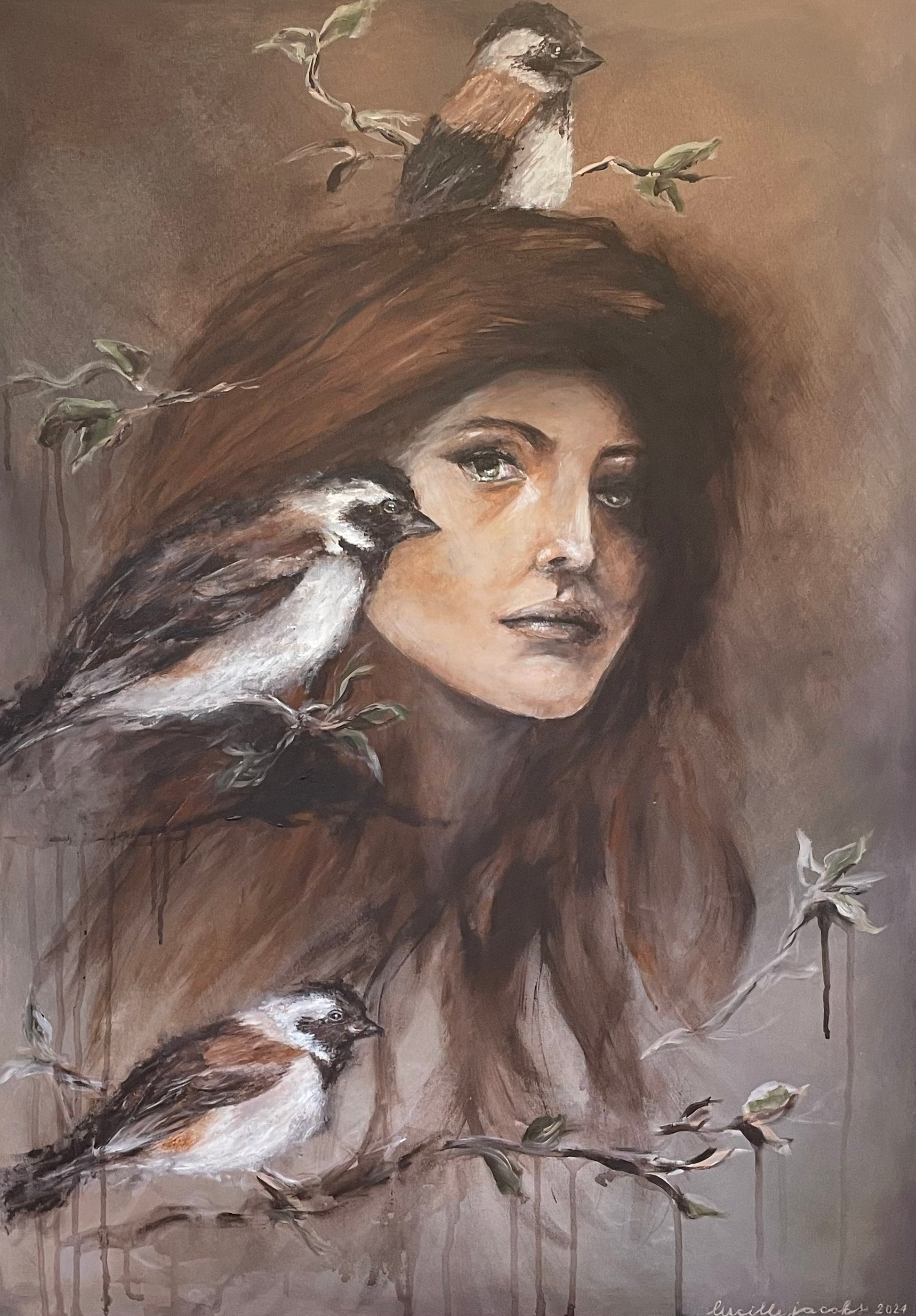 "More than many Sparrows", an acrylic painting by Lucille Jacobs, captures a woman's captivating portrait amidst branches and vibrant Cape sparrows. Expertly created with scientific precision and objective expertise, this masterpiece highlights the ever-changing beauty of nature and humanity.