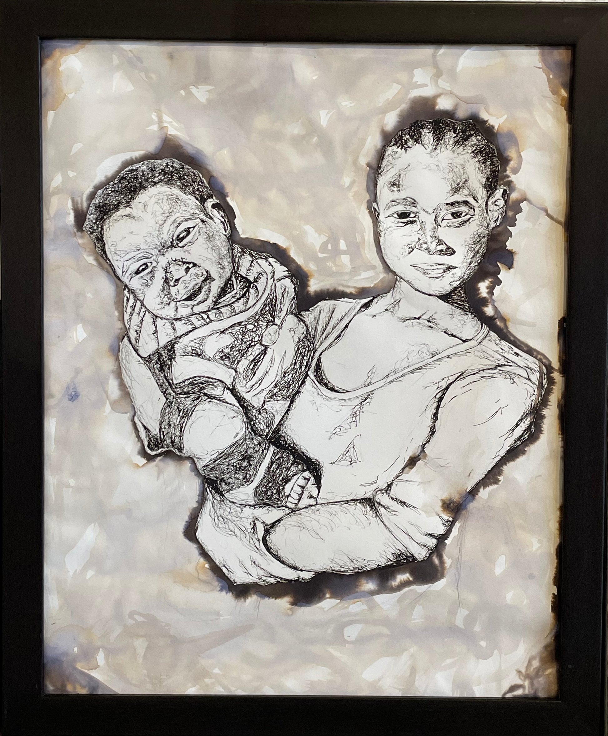 This ink drawing by Nancy Ndaba beautifully captures the bond between a mother and child. The intricate lines and detailed shading showcase the artist's skill and expertise. Bring a sense of warmth and love into your space with this stunning piece of art.