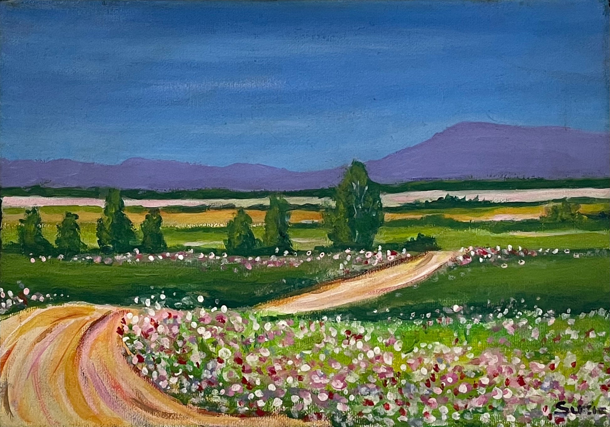 Experience the vibrant bloom of Namakwaland with this playful acrylic painting by Suzie Roos. This unique landscape captures the colorful flowers in all their glory. Bring the joy and beauty of nature into your home with Namakwaland.