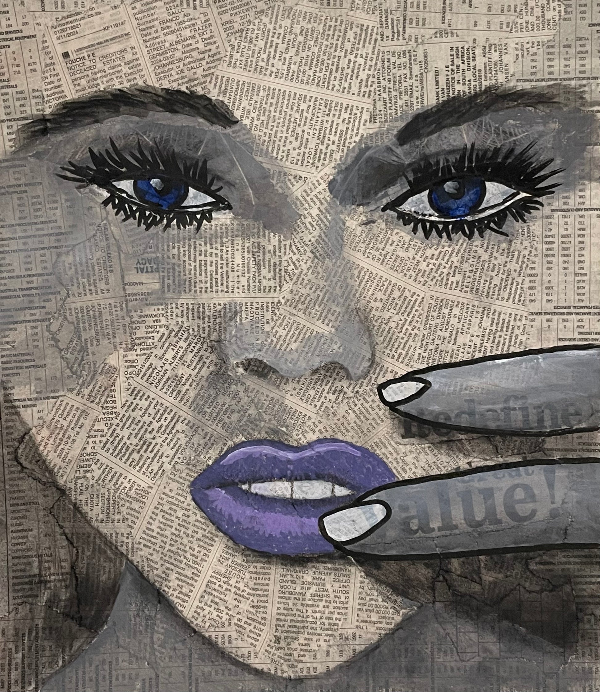 Experience the stunning combination of art and journalism with "News worthy." This captivating acrylic painting by Lee Hutton showcases a woman's portrait against a dynamic backdrop of collaged newspaper. Discover the hidden message within the torn pages, whether it's the intricate details of the subject's eyes or the intriguing juxtaposition of her hands. A masterpiece that will spark conversation and curiosity.