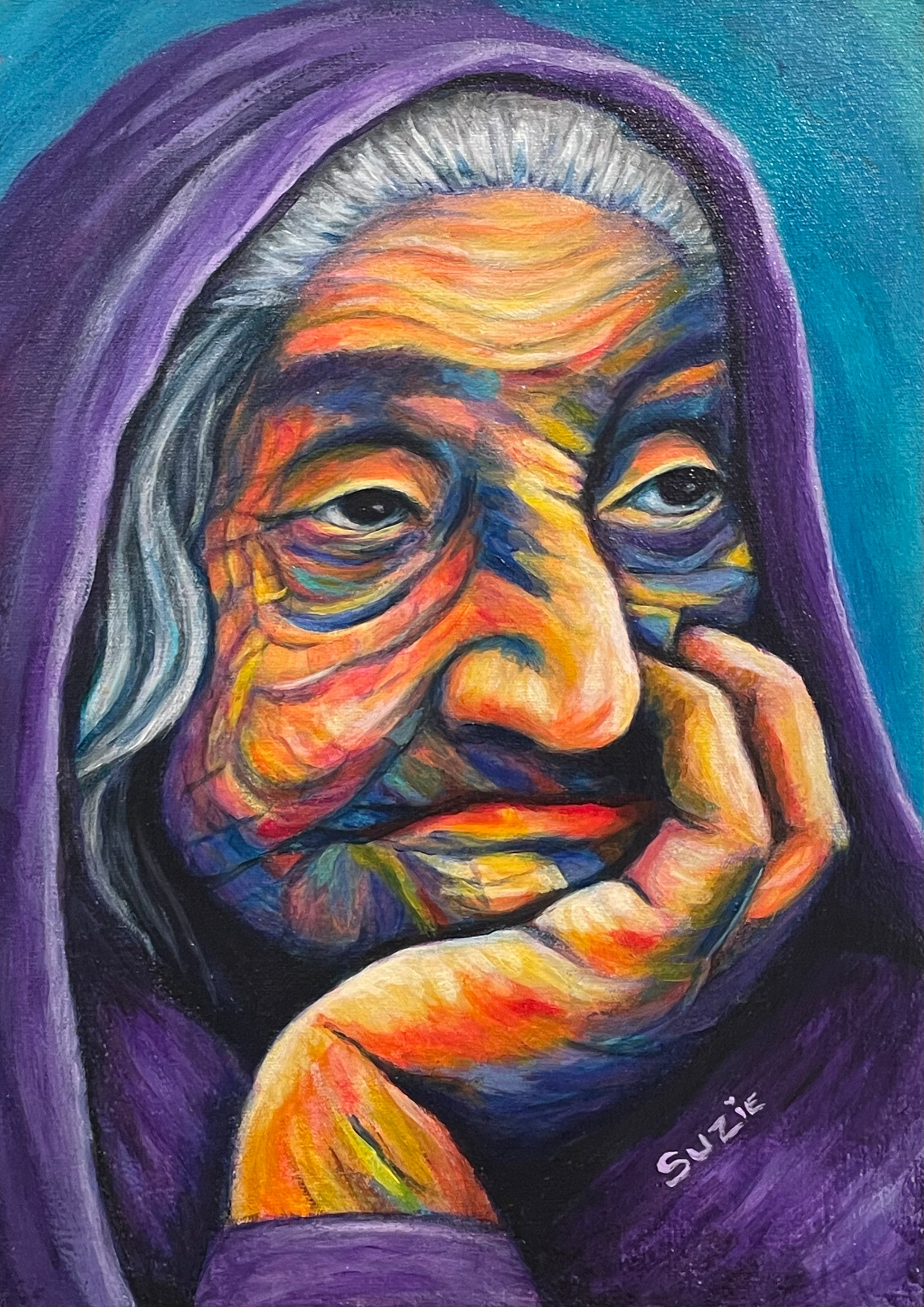 Capture the wise and whimsical essence of an old lady with this acrylic painting portrait! Perfect for adding a touch of charm and character to any space. Embrace the beauty and experience of aging with this unique piece. (A picture that truly is worth a thousand words!)