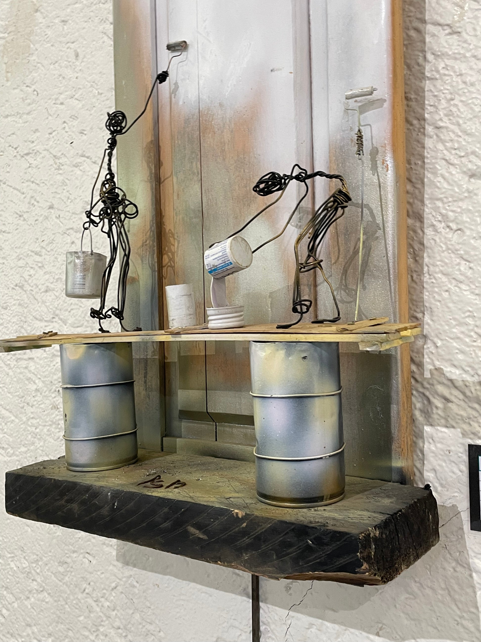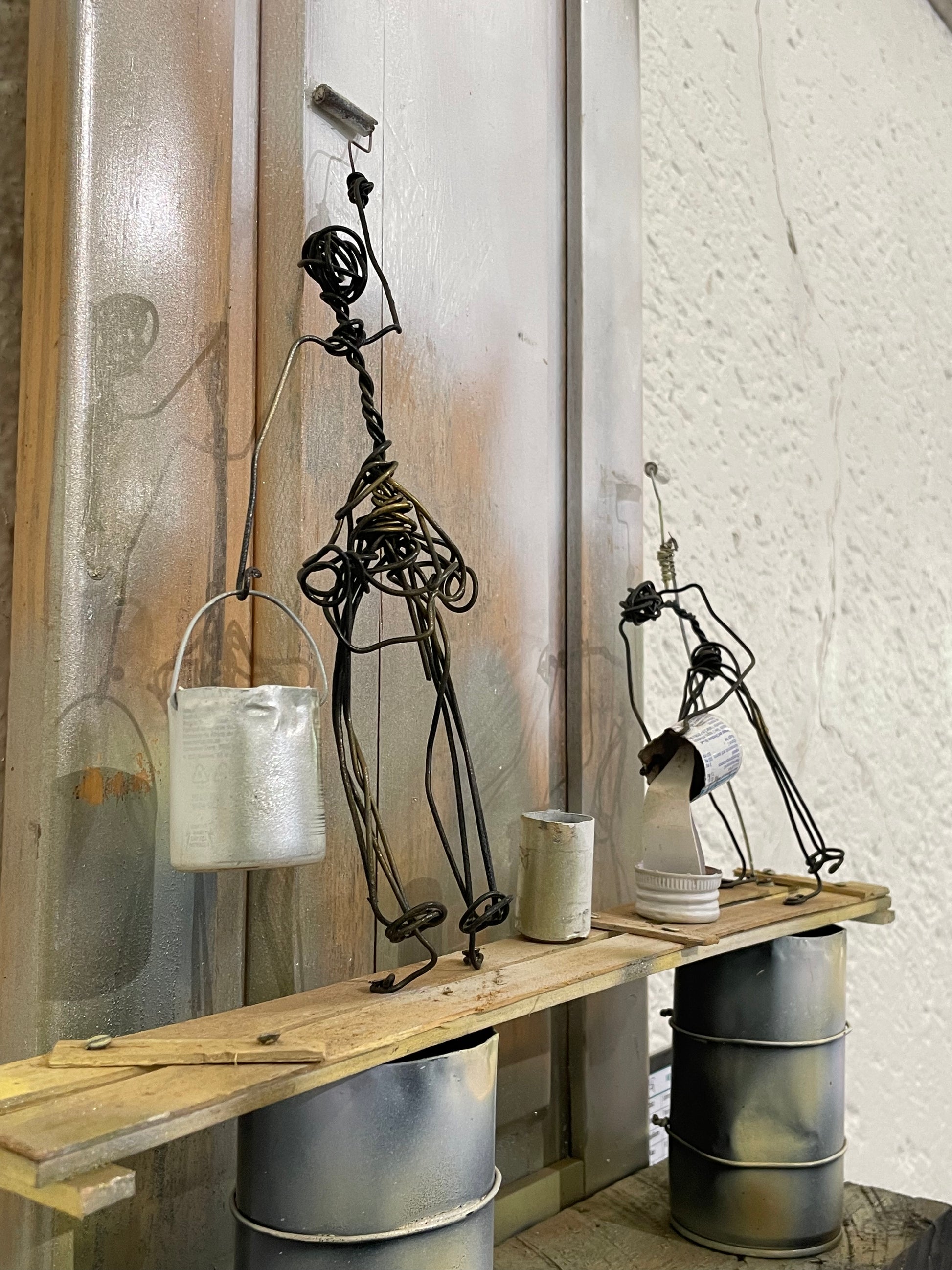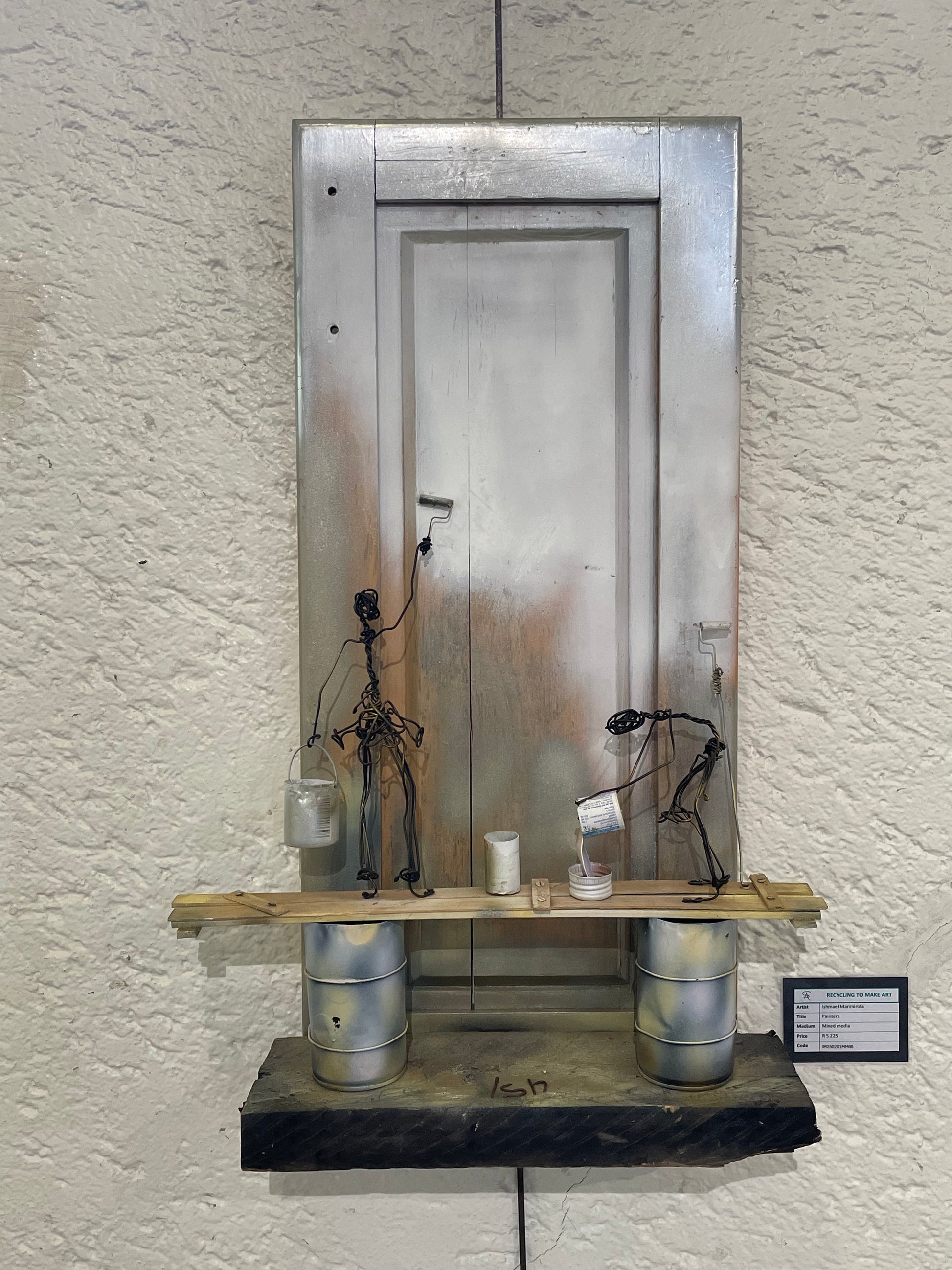 Watch two skilled painters at work in this unique and dynamic wall artwork created by Ishmael Marimirofa. Made from repurposed materials, this sculpture brings an artistic touch to any space while also showcasing the creativity and hard work of painters. A perfect addition to any art collection.