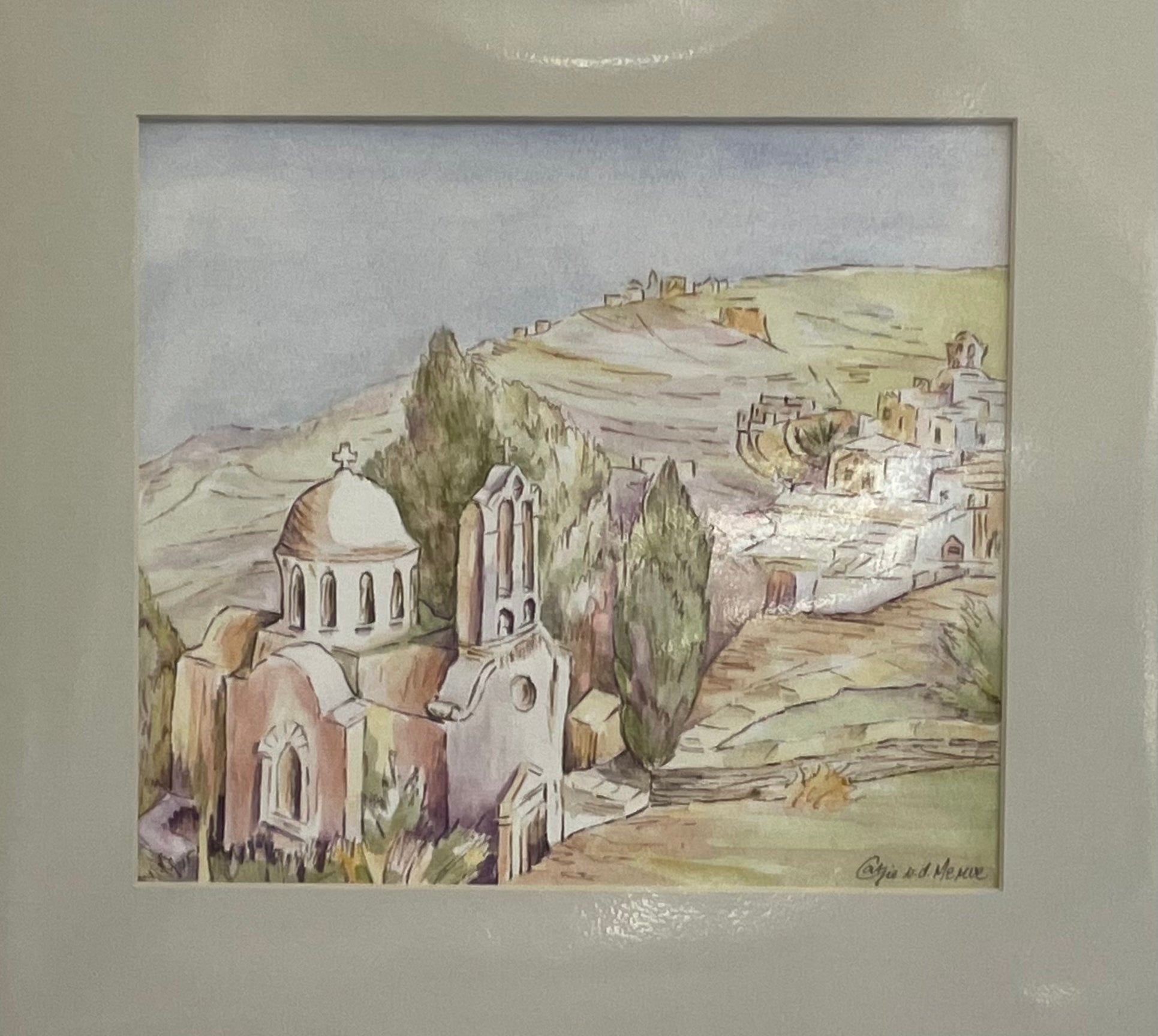 Enjoy the tranquil and serene beauty of "Peace", a stunning watercolour painting by Catjie van der Merwe. This exquisite piece depicts a charming chapel overlooking a quaint town, making it the perfect addition to any art collection. A true masterpiece that will bring a sense of calm and peace to any space.