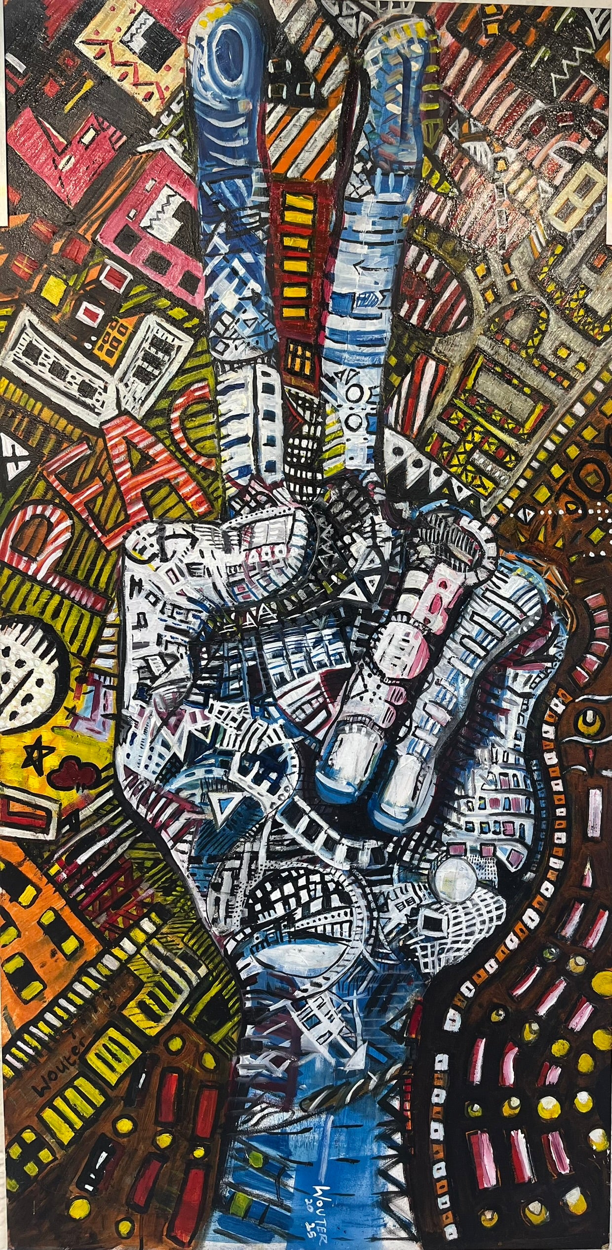 Get your hands on Peace Out - the grooviest abstract painting with a hand and peace sign. Find inner peace in this unique piece of art that adds a touch of quirkiness to any room.