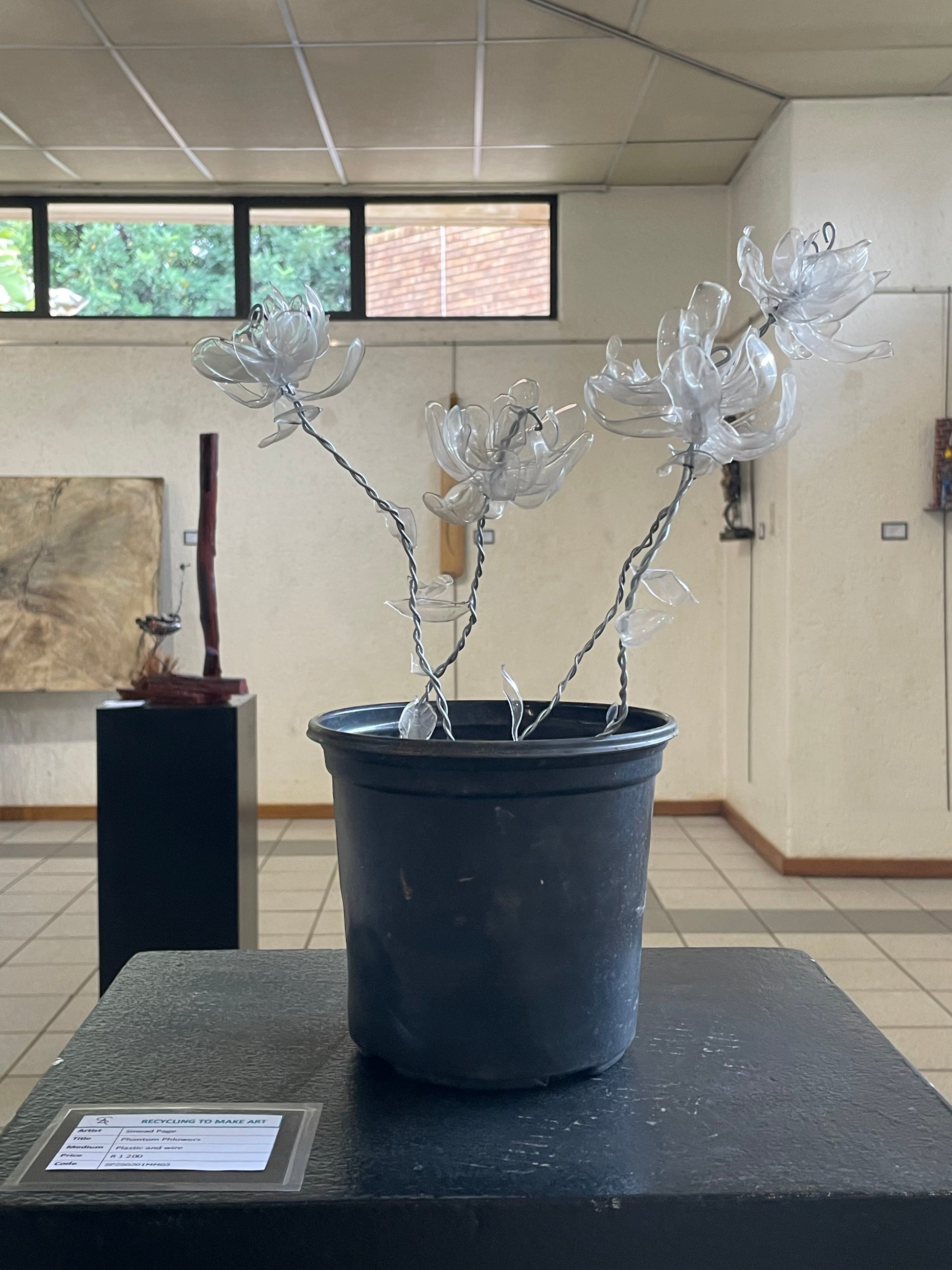 This unique sculpture is a masterpiece by acclaimed artist Sinead Page. Made from recycled plastic bottles, each flower is delicately crafted and mounted on wire stems for a lifelike appearance. Displayed in a plastic flower pot, the Phantom Phlowers is not only a stunning work of art but also environmentally-friendly.