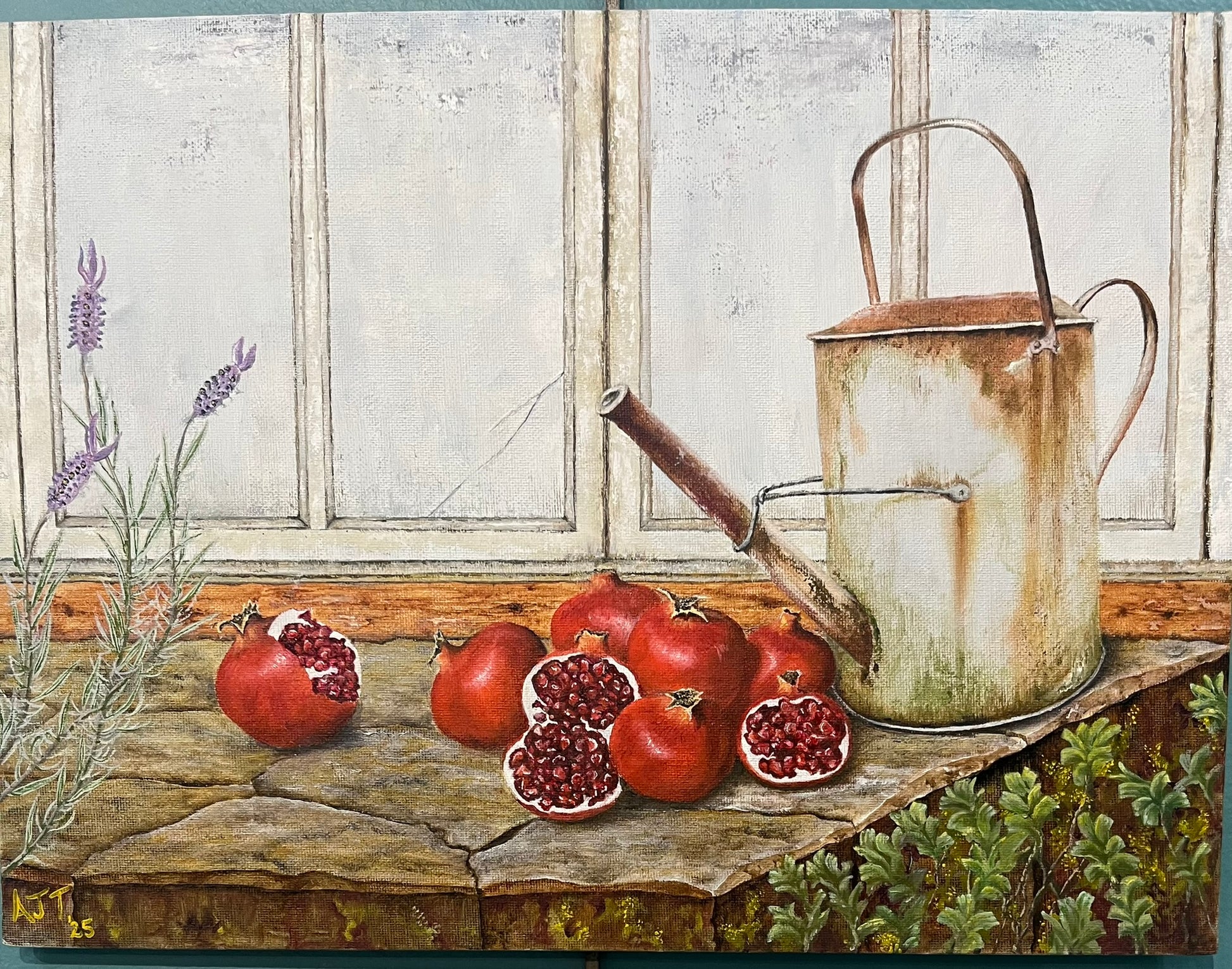 Meet the pomegranate—nature's most glamorous fruit, captured in all its jewel-toned glory. This playful still life celebrates the pomegranate's dramatic personality with vibrant colour and delightful detail.