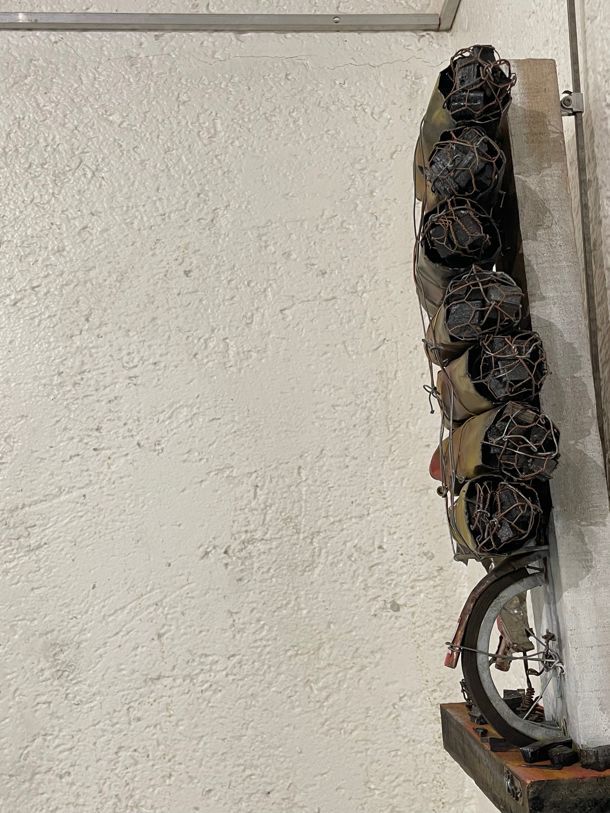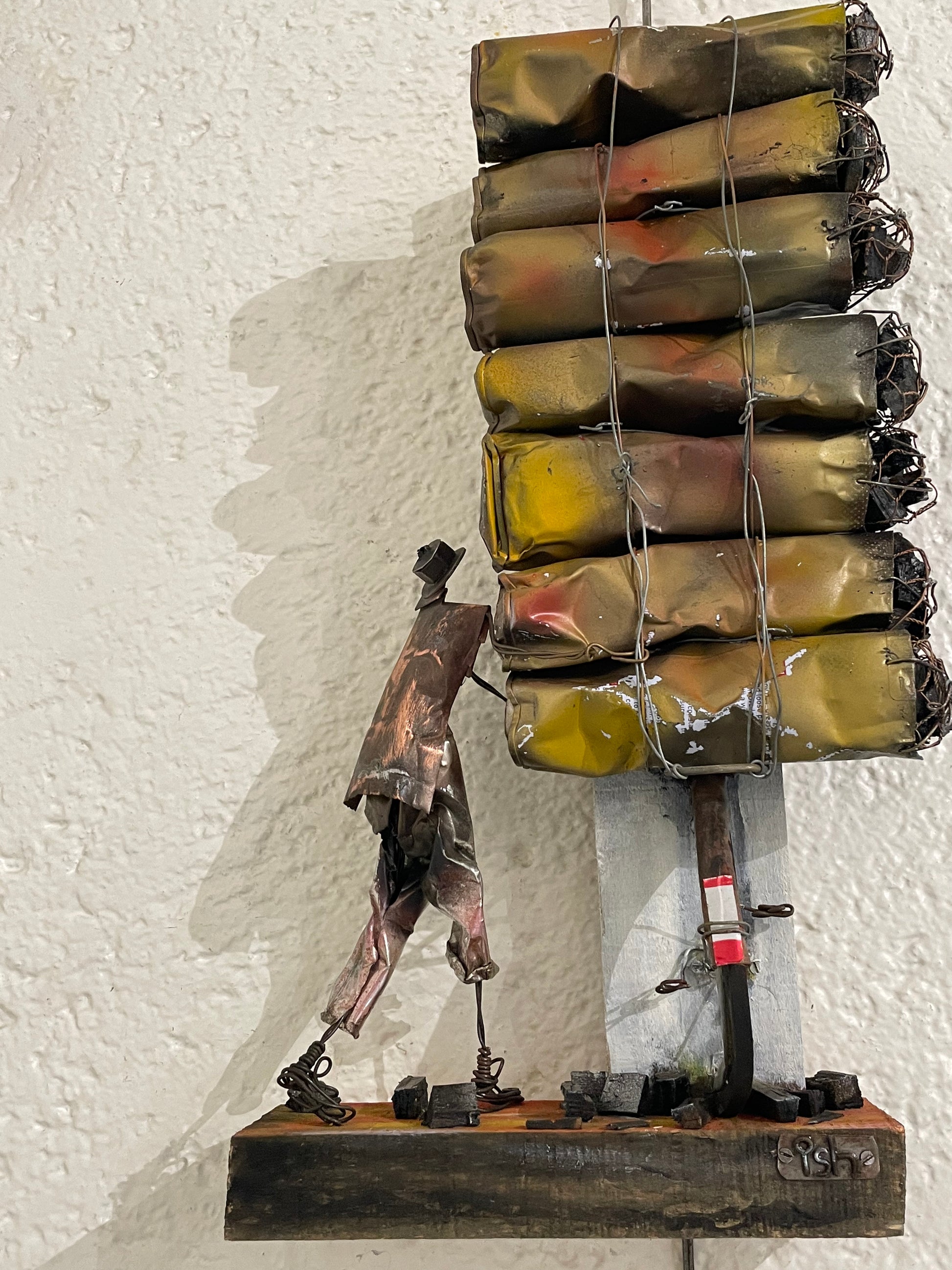 Discover the beauty and sustainability of repurposed art with Power Crisis. This unique wall sculpture by artist Ishmael Marimirofa features a person expertly stacking containers of coal on a bicycle, crafted from found materials. Embrace the message of sustainability and artistic expression with this impactful piece.