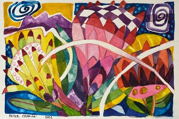 Expertly crafted by renowned artist Pieter Cronje, Proteas 1A 2023 features a stunning watercolour painting of abstract proteas. Embrace the beauty of nature with this one-of-a-kind piece that adds a touch of elegance to any space. A must-have for art enthusiasts and collectors.