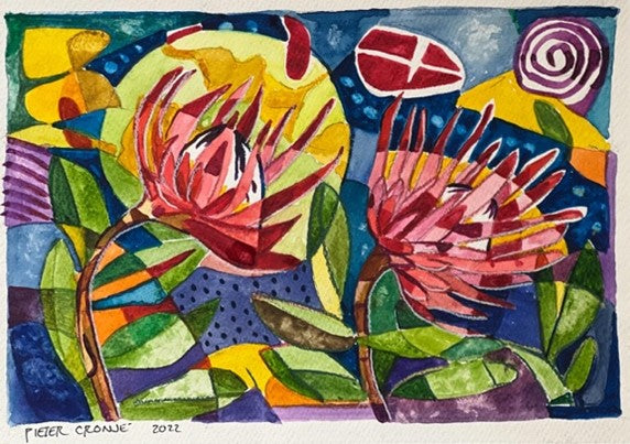 Discover the exquisite artistry of renowned painter Pieter Cronje with Proteas 2A 2023. This unique piece boasts an exquisite watercolour depiction of abstract proteas, bringing the beauty of nature into any space. The perfect addition for art aficionados and collectors alike.