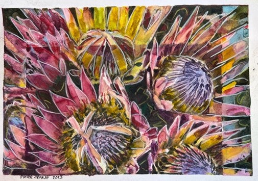 Explore the exquisite elegance of Proteas with the Proteas x - 2023 collection. Skillfully crafted by renowned artist Pieter Cronje in watercolour, this piece captures the intricate details and vibrant colors of these exotic flowers, making it the perfect addition to any room.