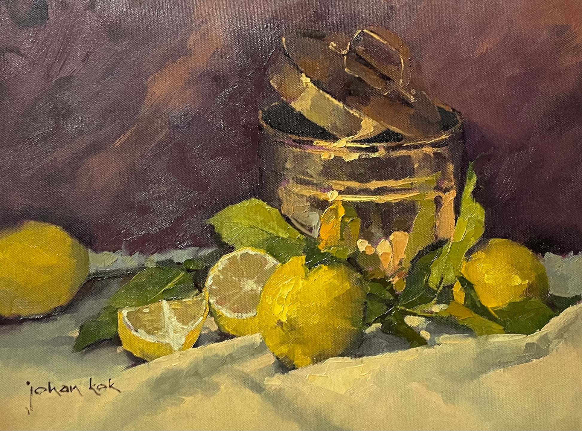 Add a touch of elegance to your home with "Reflections in Copper," an oil painting still life by renowned artist Johan Kok. The intricate details of the copper container, lemons, and leaves create a stunning visual display that will bring warmth and sophistication to any room.