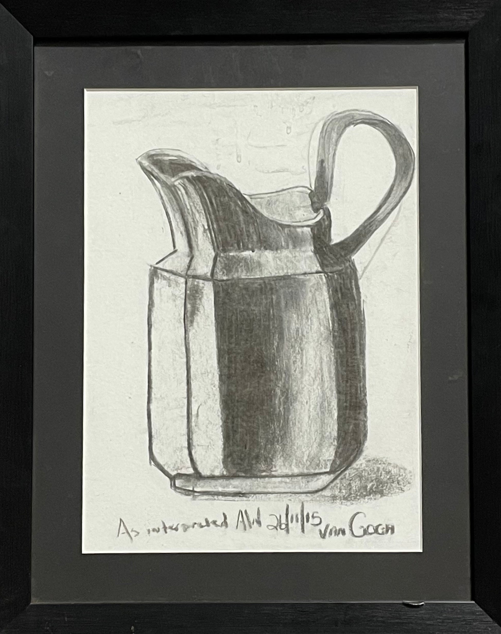Enhance your space with a stunning pencil drawing of a jug by Annette Wessels. The detailed lines and shading bring a sense of tranquility and renewal to any room.