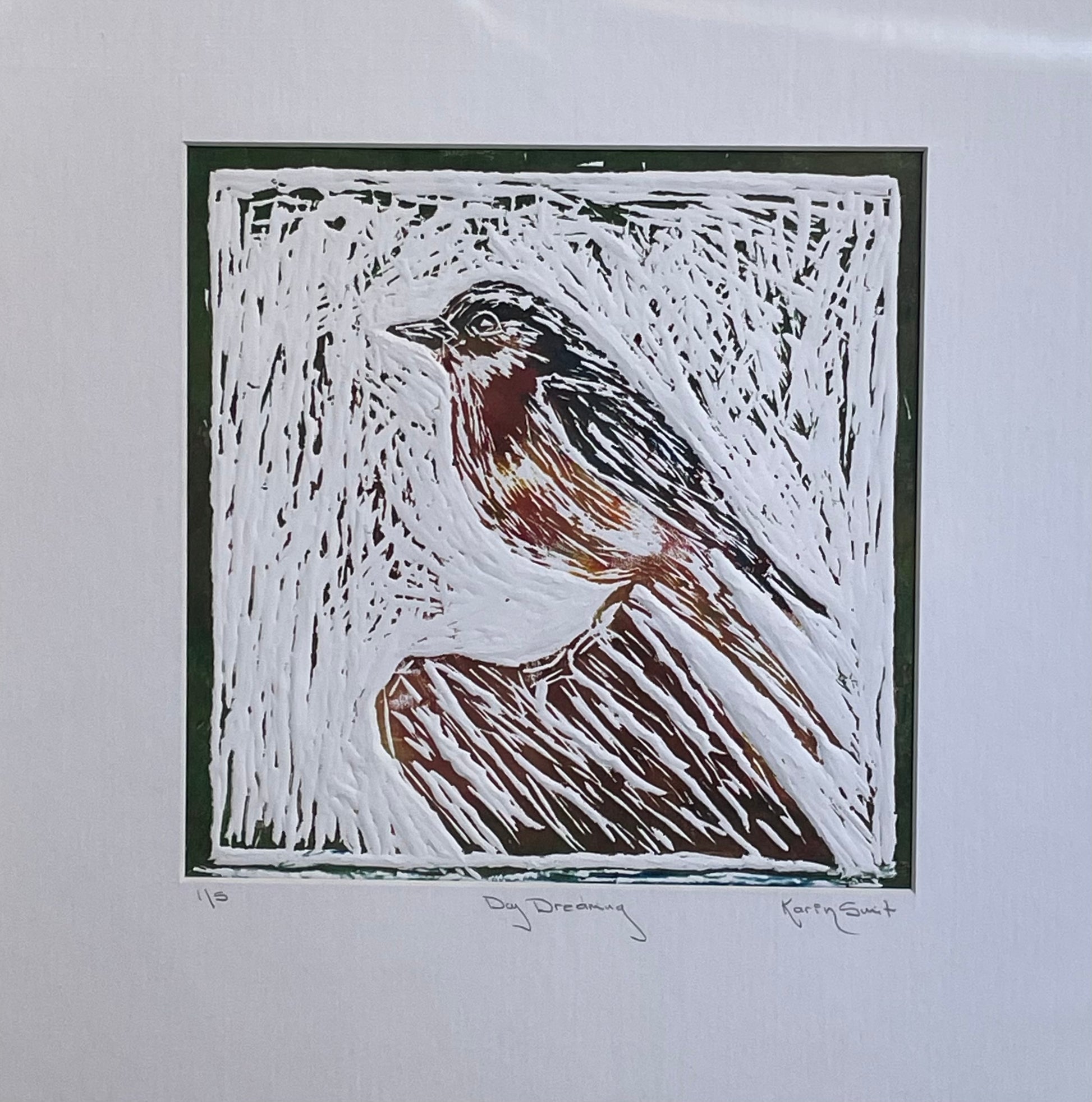 Resting: A striking linocut art piece featuring a tranquil bird, elegantly printed on fabriano paper. Transform your space with this refined and exclusive artwork, adding a touch of sophistication to any room. Immerse yourself in the beauty of nature and awaken your senses with this exquisite print.