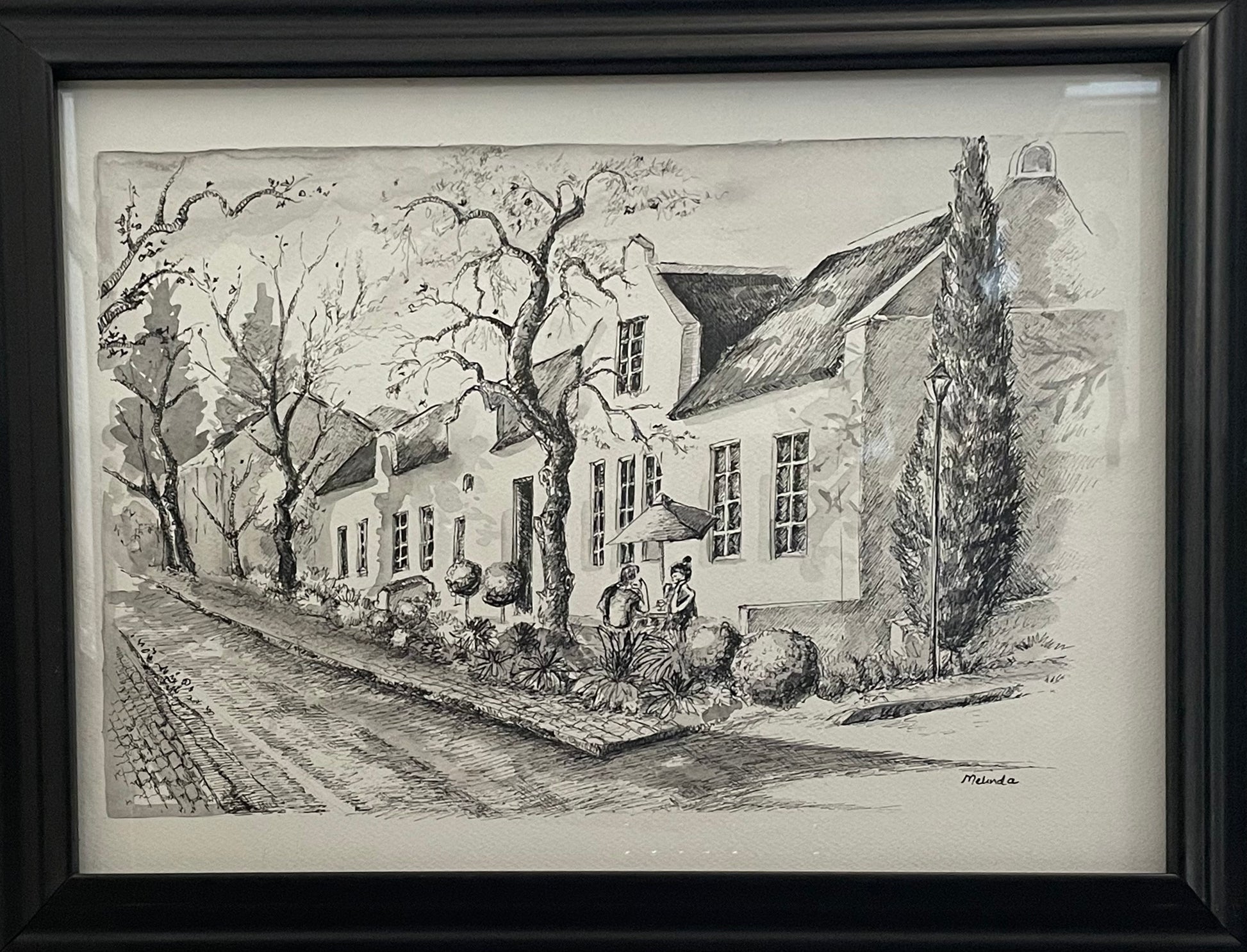 Explore the beautiful cityscape of Stellenbosch through the intricate pen and ink drawing by Melinda Engelbrecht. Let her attention to detail transport you to the romantic streets of this charming town. Perfect for lovers of art and travel alike.