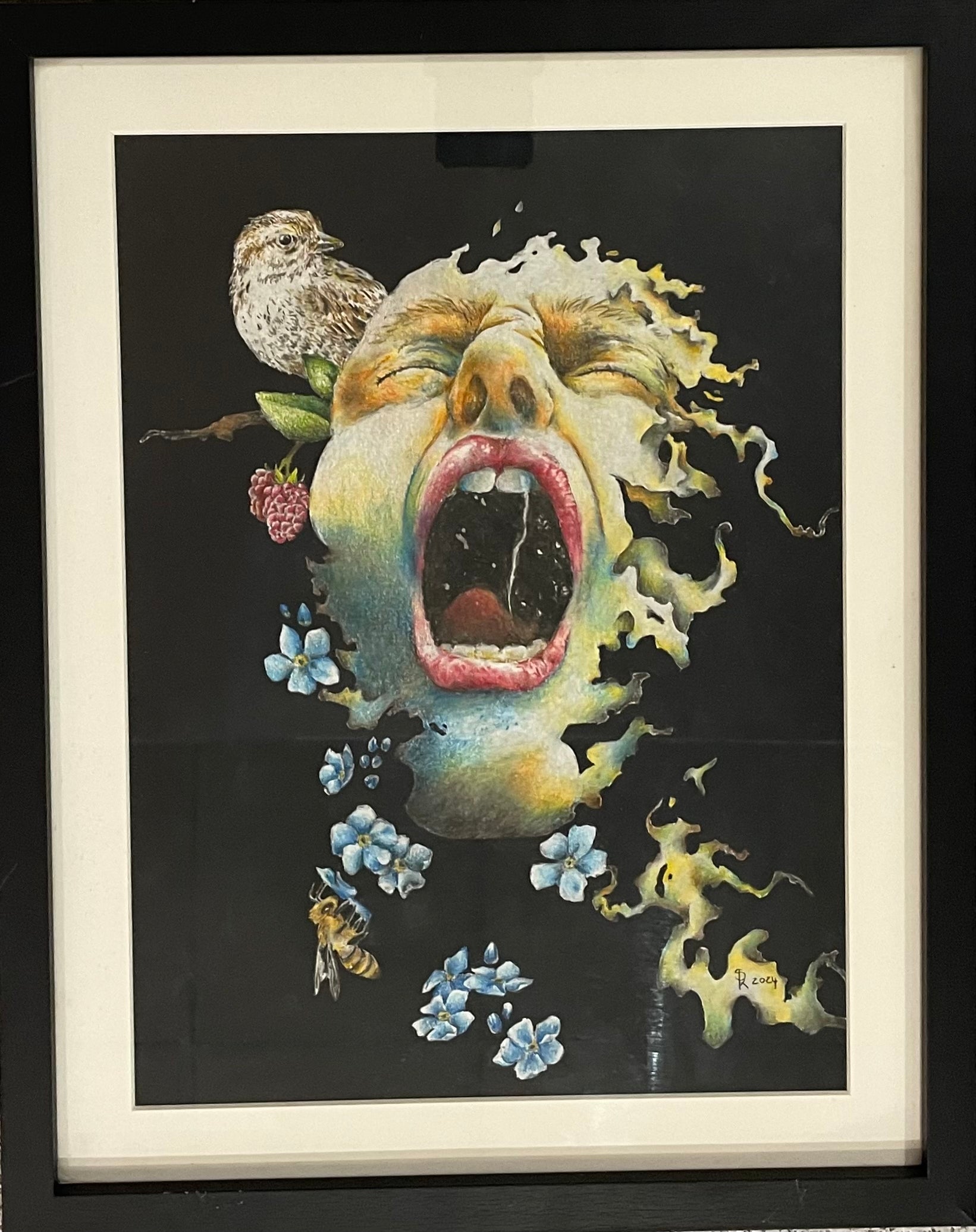 This unique colour pencil portrait by Simoné Kotzé captures a woman's scream as nature and fire converge. Featuring delicate details of flowers, fruits, a bee, and bird, this powerful artwork showcases the beauty and intensity of the natural world. Own this one-of-a-kind piece and bring nature's screams into your home.