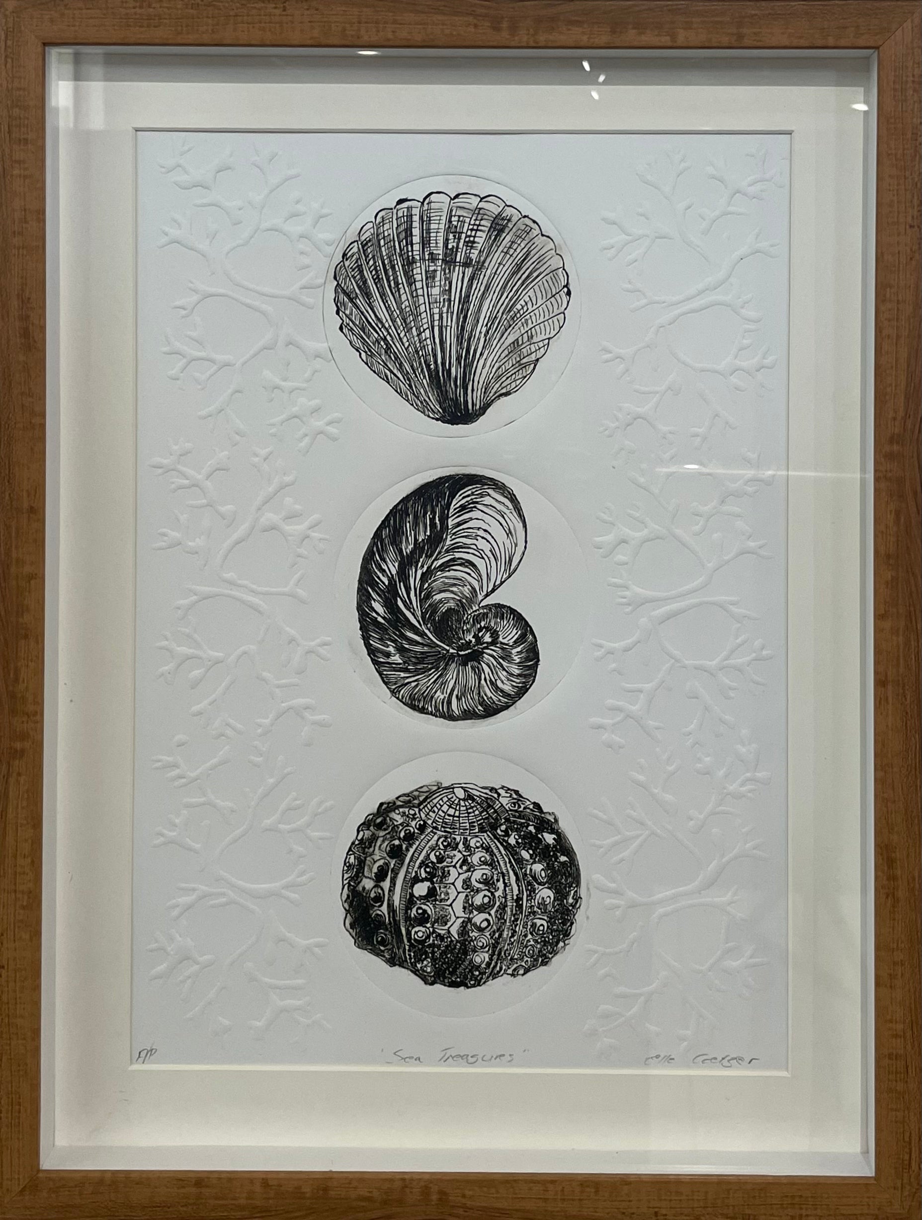 Discover the beauty of the ocean with Sea Treasures, a stunning drypoint print by Christelle Coetzer. Featuring three intricately embossed shells in circular formations, surrounded by delicate embossing resembling coral. Add a touch of elegance to your décor with this unique piece.
