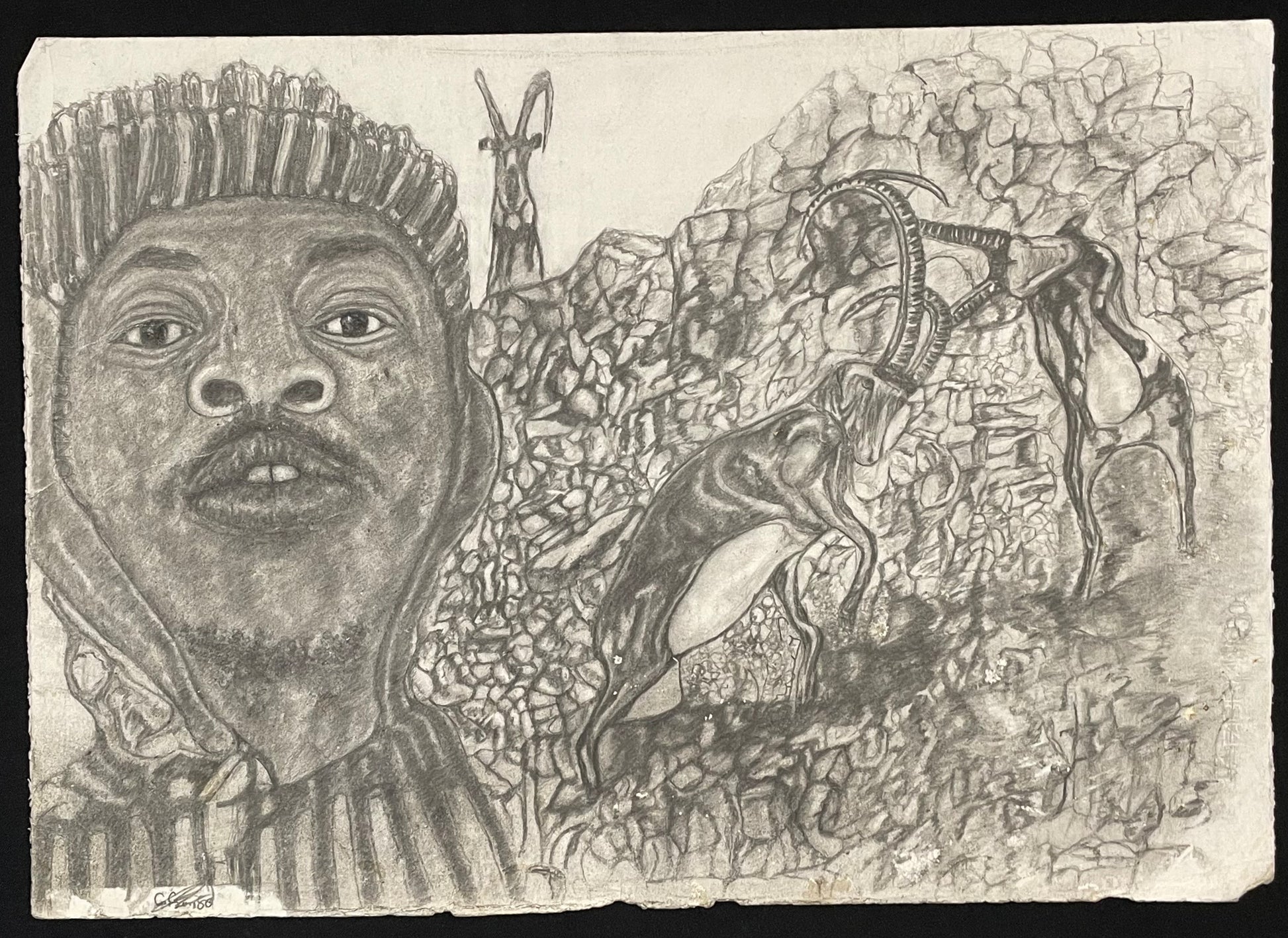 Indulge in the sophisticated elegance of the "Self Portrait: Dinakana" by Shimane Seemise. This stunning drawing, done in graphite, captures the soulful depths of the artist's self-reflection. Expertly crafted with intricate detail, this piece is a true testament to the beauty of self-expression. Featuring a majestic buck, it invites you to explore the connection between nature and self.