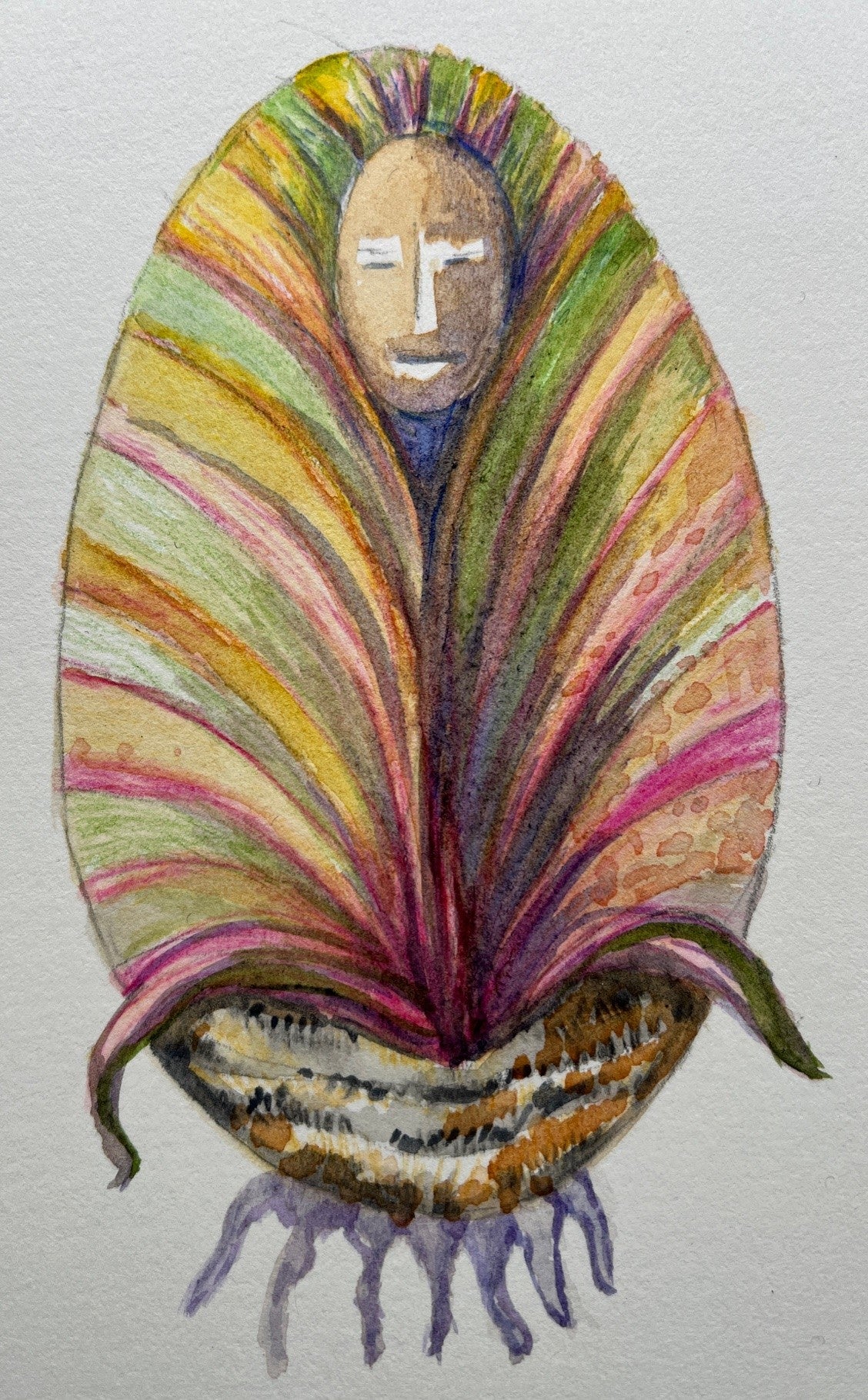 This limited edition watercolour paintings depicts the interdependence between man and plant. This grassland Bushman Bulb plant or Century plant (bophoone disticha) is used by the bushman for medicinal purposes. Like man, the plant also has a distinguished cycle of life. During Autumn the plant dies - losing its fan-like leaves and going into Winter the plant has soft scales protecting the bulb. While in Spring it has pink fingery-like flowers blooming into summer with a reddish single umbel with grey-green ribbon leaves.