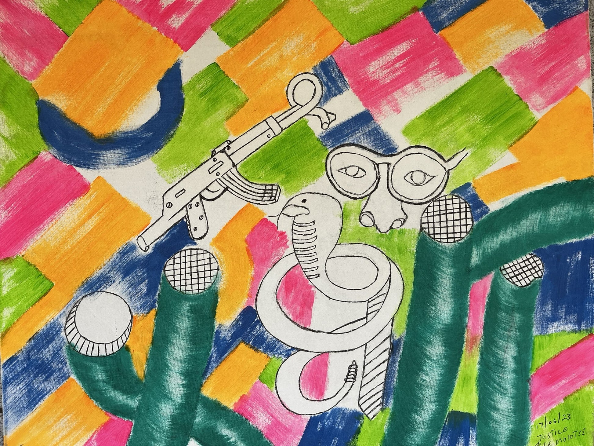 "Silence the Guns," a contemporary abstract painting that confronts the dangers of violence through evocative imagery. This thought-provoking artwork combines bold brushstrokes and symbolic elements to advocate for reflection.