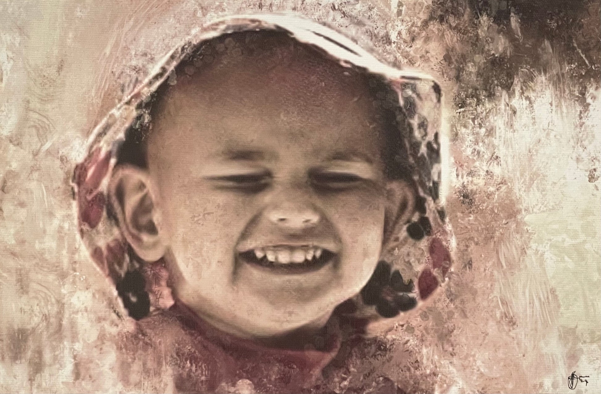 This digitally manipulated photograph captures the joy and innocence of a young child laughing in the sun. The vibrant colors and playful composition, created by the talented Judy Bornman, make this portrait a beautiful addition to any space. Perfect for adding a touch of warmth and happiness to your home or office.