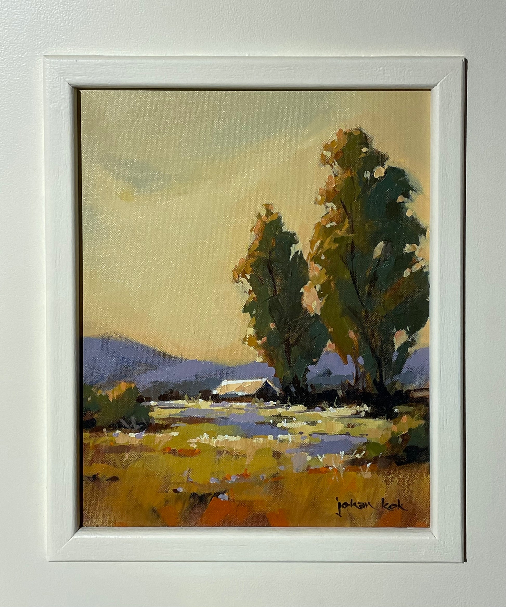 Indulge in the tranquil beauty of Johan Kok's landscape oil painting, featuring majestic mountains, a quaint house, and lush trees. Radiating a soft warm light, this piece will add a touch of sophistication to any room. Immerse yourself in the serenity of nature with this premium masterpiece.