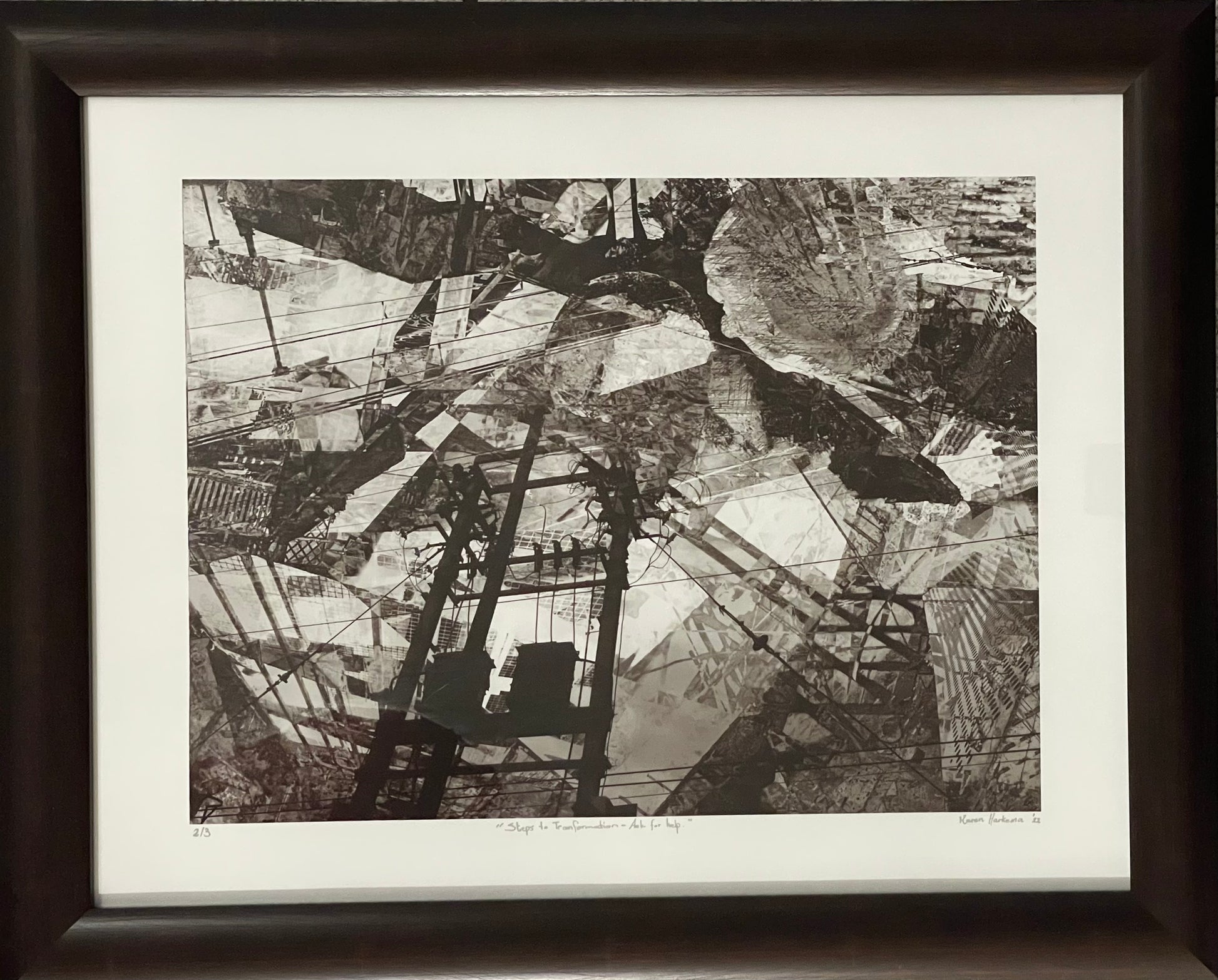 Unlock the key to change with "Steps to Transformation: Ask for Help" by Karen Harkema. This unique piece showcases a digital print of a captivating photo collage, igniting inspiration and motivation towards personal growth. Elevate your space with this exclusive art piece and invite the transformation you've been craving.