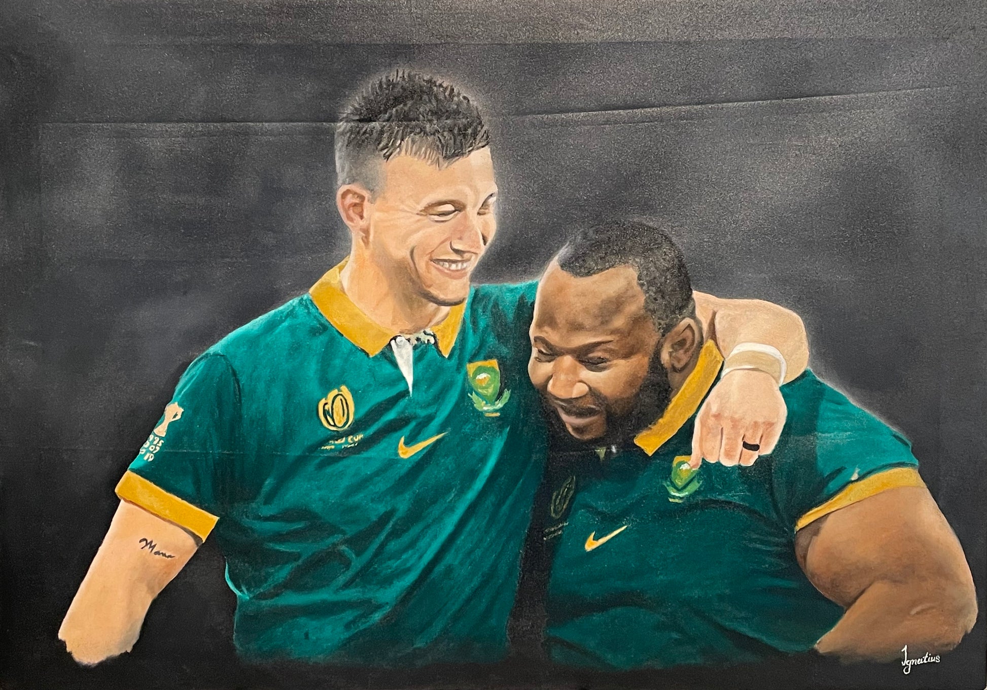 Discover the power and finesse of South African rugby through this beautiful oil painting by Ignatius Manzini. Recapture the unforgettable 2023 triumph against England, featuring Ox Nché's pivotal role in the late scrum push, culminating in a game-winning penalty by Handre Pollard. A must-have addition for any fan of rugby and art. Sports unite people.