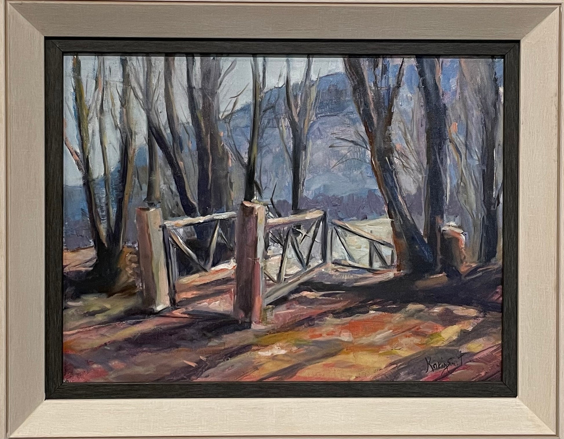 Introducing the Sunnyside Bridge, a stunning oil painting by Karin Smit featuring a bridge enveloped in winter sunlight and framed by barren trees. Add a touch of elegance to your space with this luxurious artwork that captures the beauty of nature in a sophisticated and exclusive style.