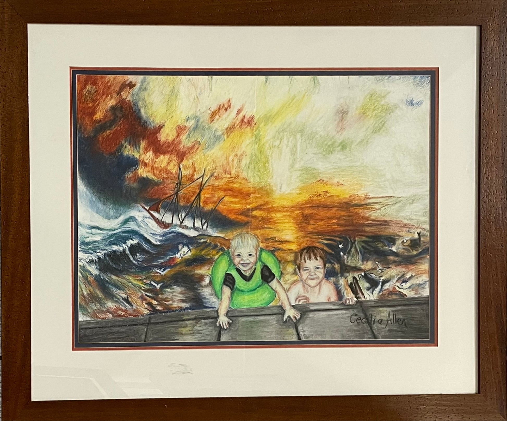 Experience the calm in the midst of chaos with "Surviving the Storm" by Cecilia Allen. This stunning oil pastel drawing depicts two children with life-saving floatation devices, braving the stormy seascape in the background. A reminder to keep smiling and hold on tight during life's challenges. (Luke 8:24)