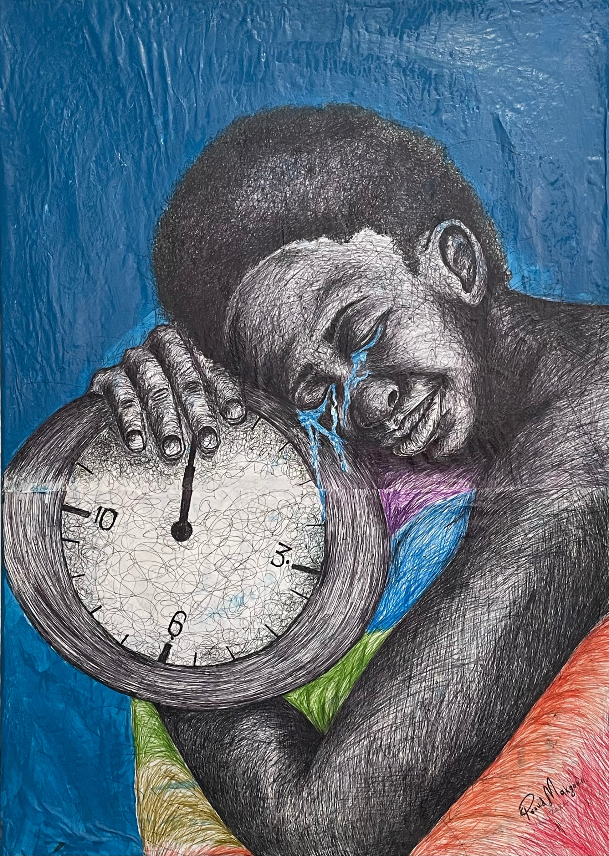 Experience the beautiful, emotional impact of "Take Your Time." This mixed media portrait captures a person resting on a clock, symbolizing the importance of taking a moment to breath and reflect. With tears flowing from closed eyes, this artwork reminds us to slow down and appreciate the present.