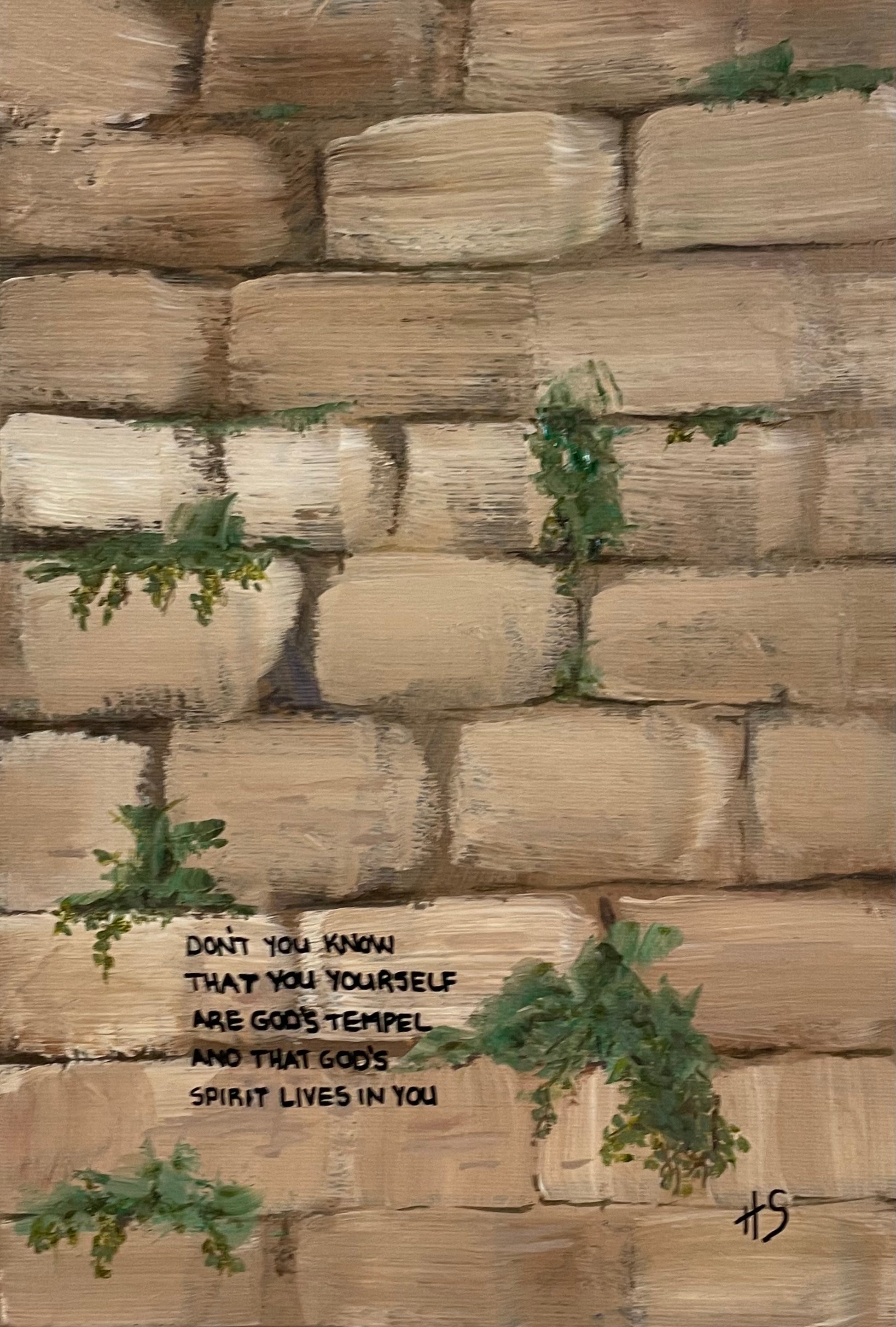 Transform any room into a sanctuary with "Tempel" by Helena Stuart. This exquisite oil painting depicts a brick wall adorned with lush plants and a powerful message that reminds you that you are God's temple. Add a touch of tranquility and inspiration to your space with this stunning piece.