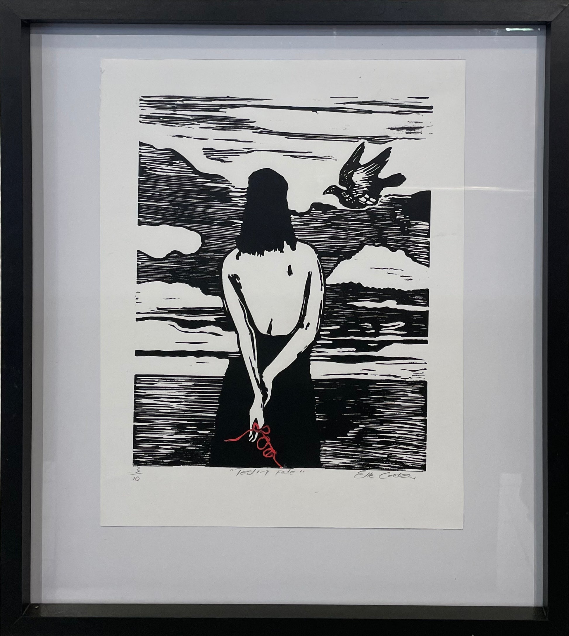 Experience the captivating linocut print "Testing fate" by Christelle Coetzer. This stunning artwork depicts a woman gazing over a serene body of water, with a distant mountain and clouds above. A dove gracefully flies in front of her as she holds a red ribbon behind her, evoking a sense of mystery and contemplation. Bring this unique piece into your home and inspire your own sense of wonder.