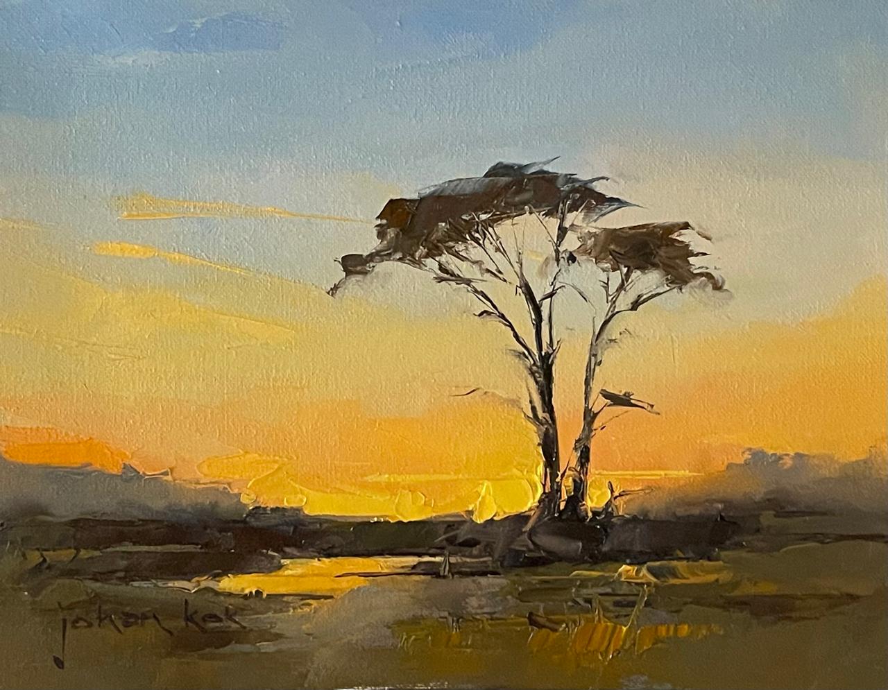 This impressive oil painting captures the stunning beauty of nature, featuring a graceful tree overlooking a tranquil brook with a radiant sunset in the background. Enhance your space with this exquisite piece that brings serenity and tranquility to your surroundings.