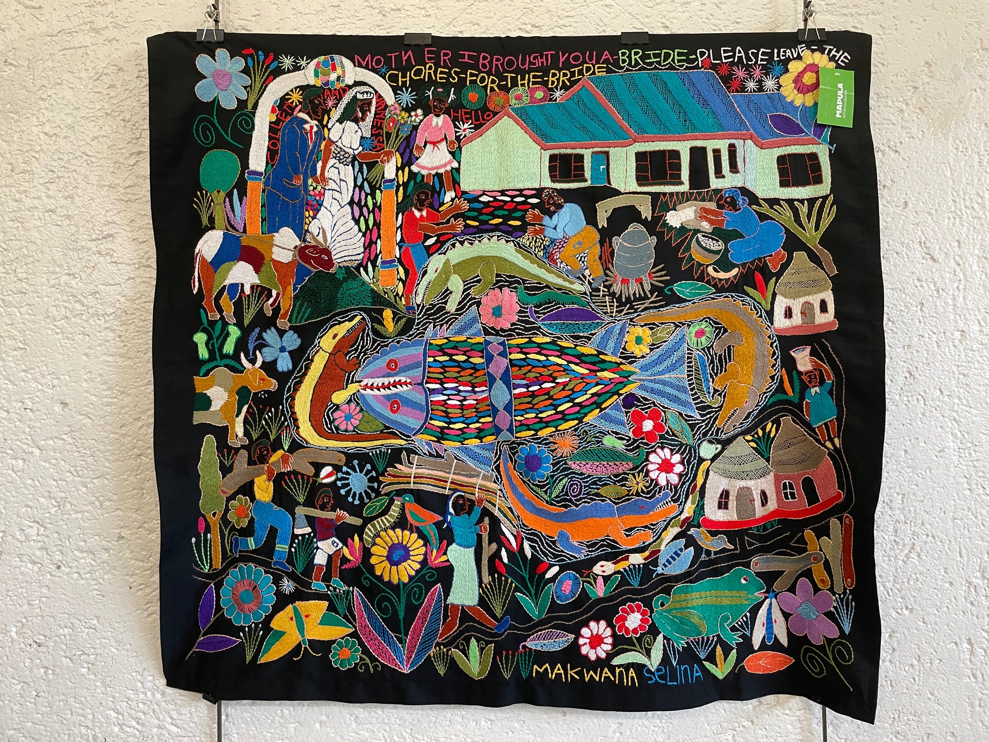 Embroidered by Selina Makwana, this township scene is a masterpiece of hand embroidery on Edenrose cotton, created by the talented artist at Mapula Embroideries.