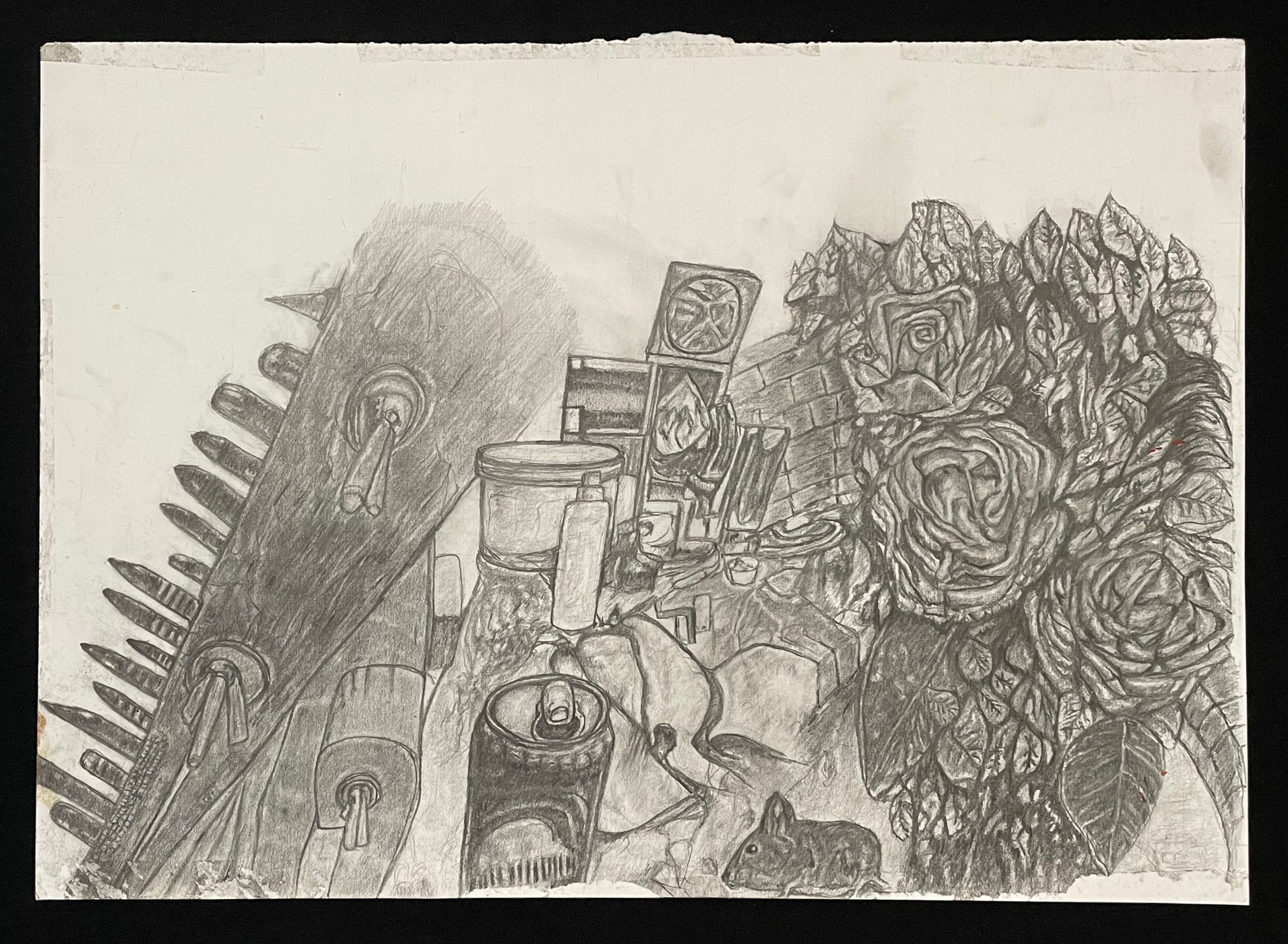 Indulge in the whimsical world of "The Journey of the Mouse," a masterful graphite drawing by Shimane Seemise. This enchanting piece captures a tiny mouse amidst a dreamlike landscape of everyday objects, from cans to roses, evoking a sense of magic and wonder. A must-have for any art lover.