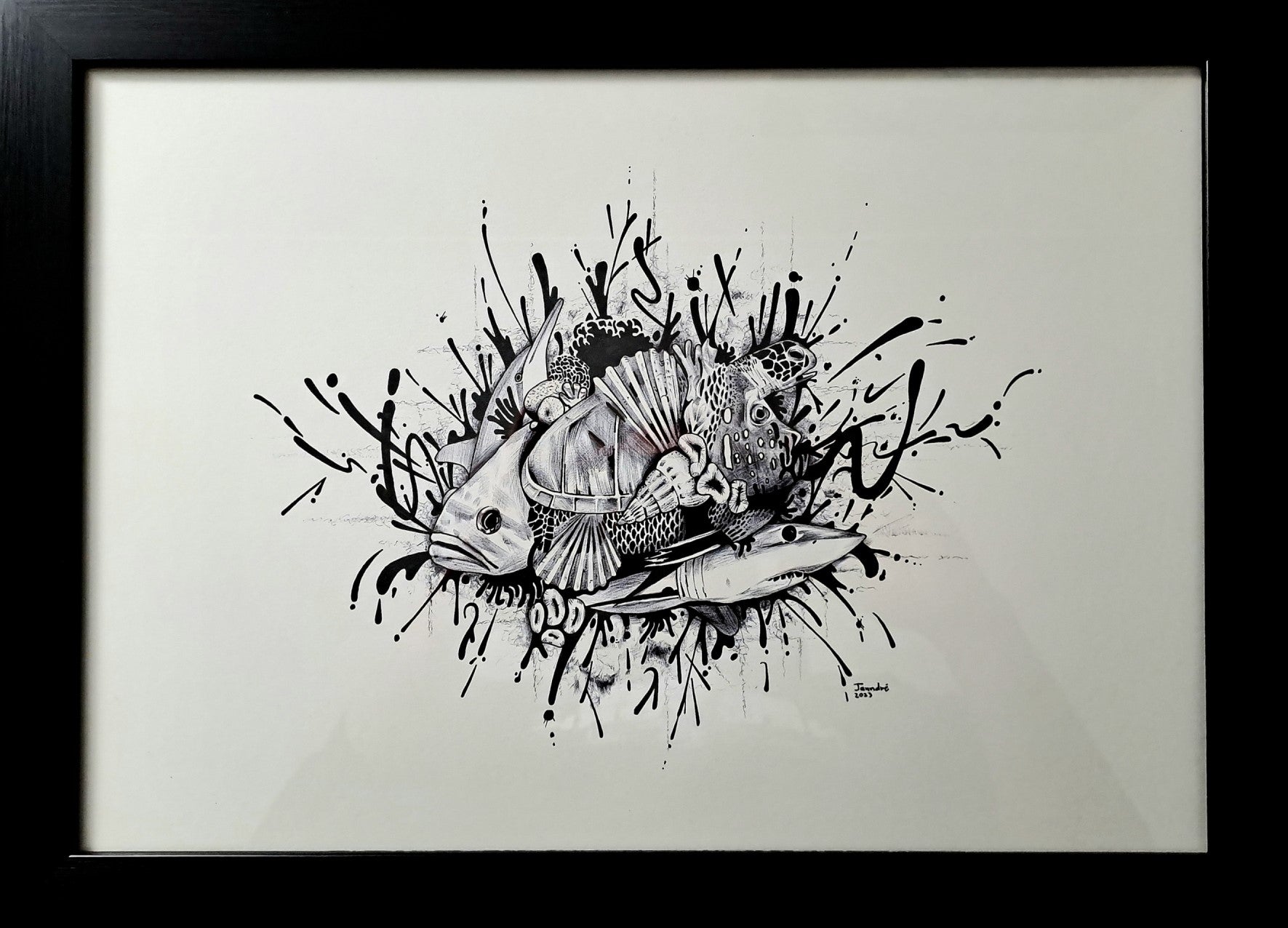 Experience the captivating depths of the ocean with "The ocean, drowning (2023)". The abstract composition, paired with a detailed fish pen drawing by Jaundré van Breda, brings the beauty and mystery of the sea to life. Dive into the enchanting world of this piece and let your imagination swim wild.