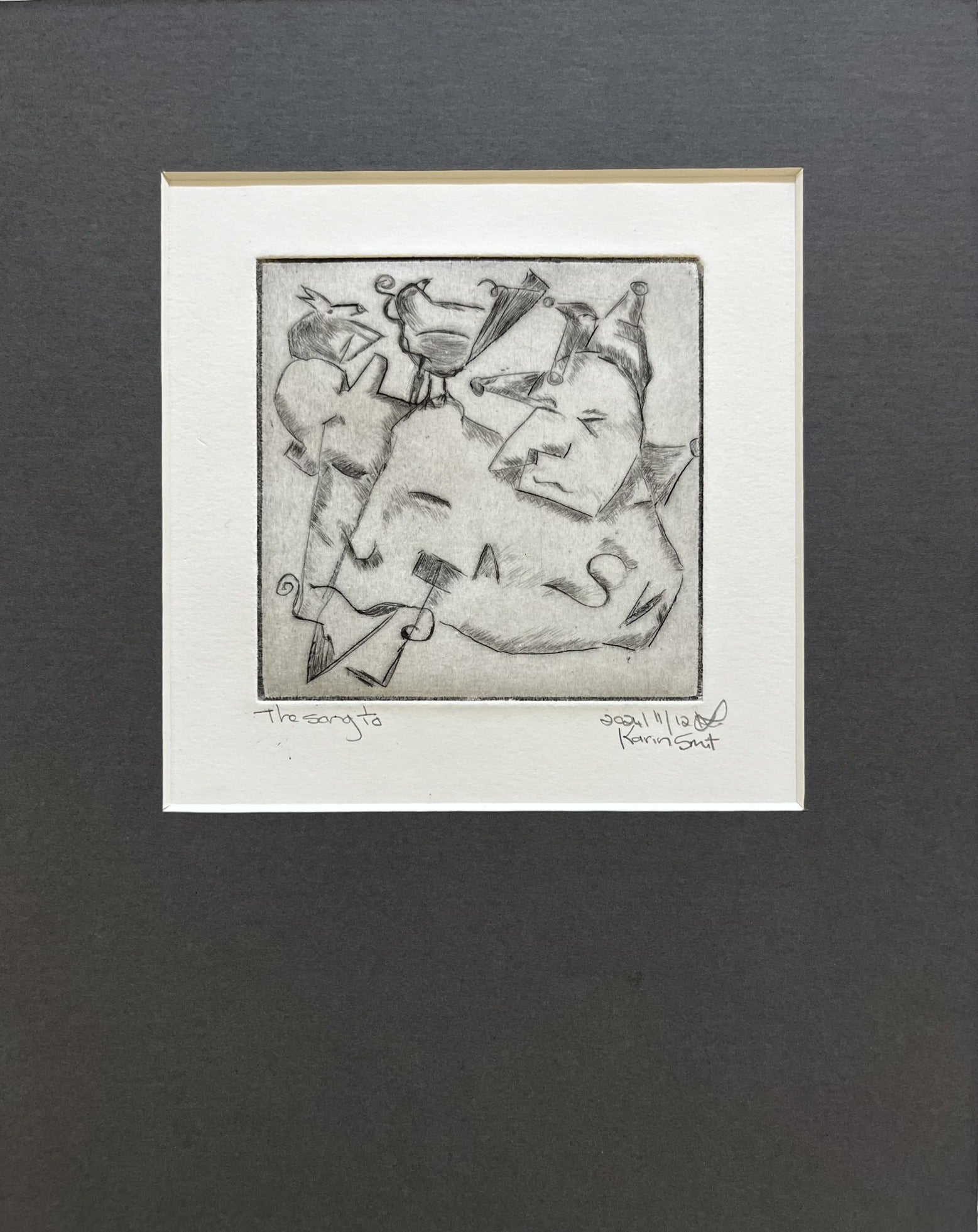 Yet another quirky dry point etch printed in two colours to brighten the walls of those who prefer the extraordinary.