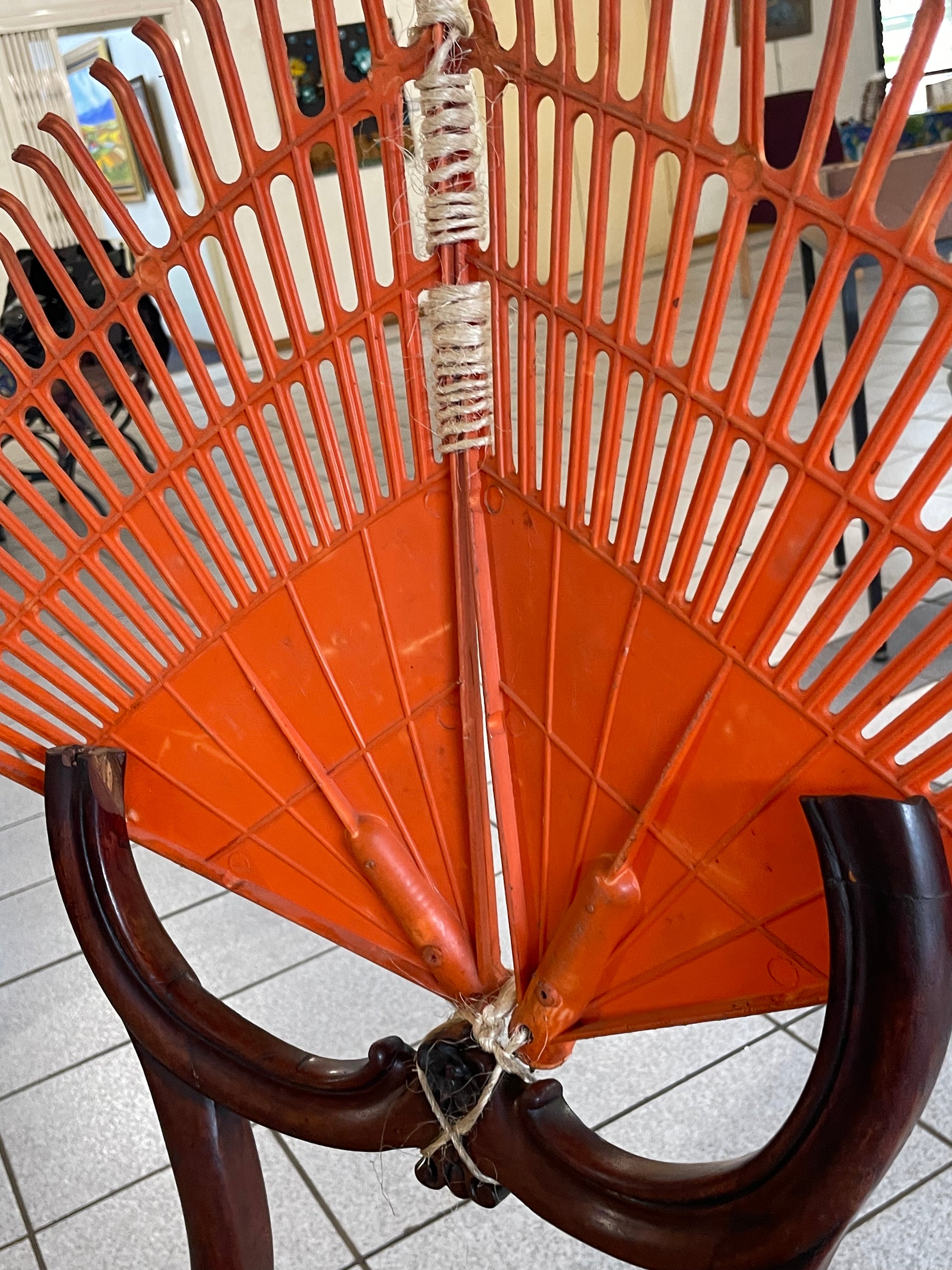 Experience the unique blend of art and functionality with The Throne. Sculpted by Carol Preston using found materials, this piece features a broken antique Victoria Irish Bubble Bat chair balanced on a plastic pallet, with a rake serving as the back rest. An invitation to take a seat, but also a subtle sense of unease.