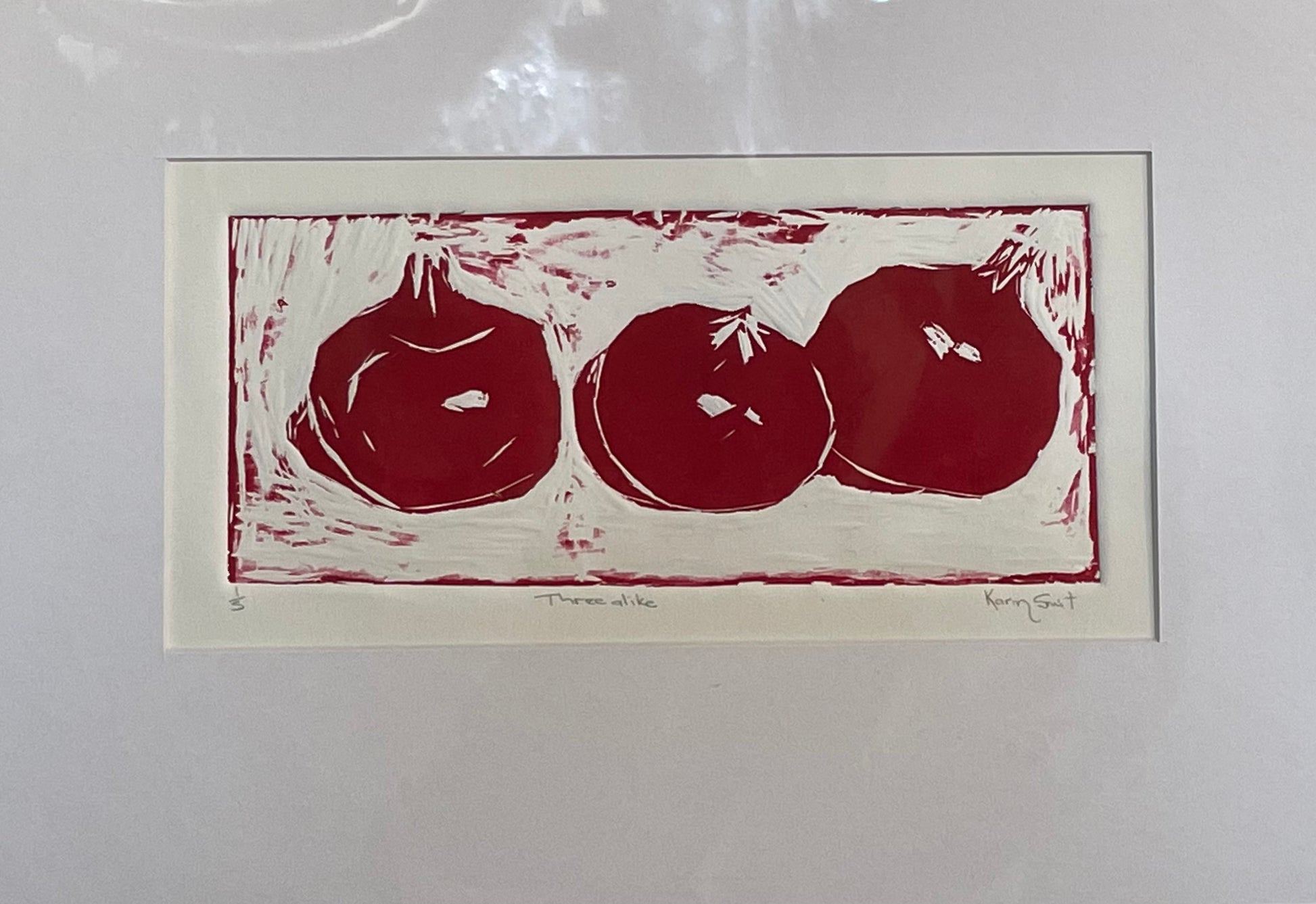 Indulge in the exquisite Three of a Kind, featuring a linocut print on luxurious Fabriano paper. This unique artwork showcases three vibrant pomegranates, adding a touch of sophistication and elegance to any space. Elevate your decor with this exclusive piece.