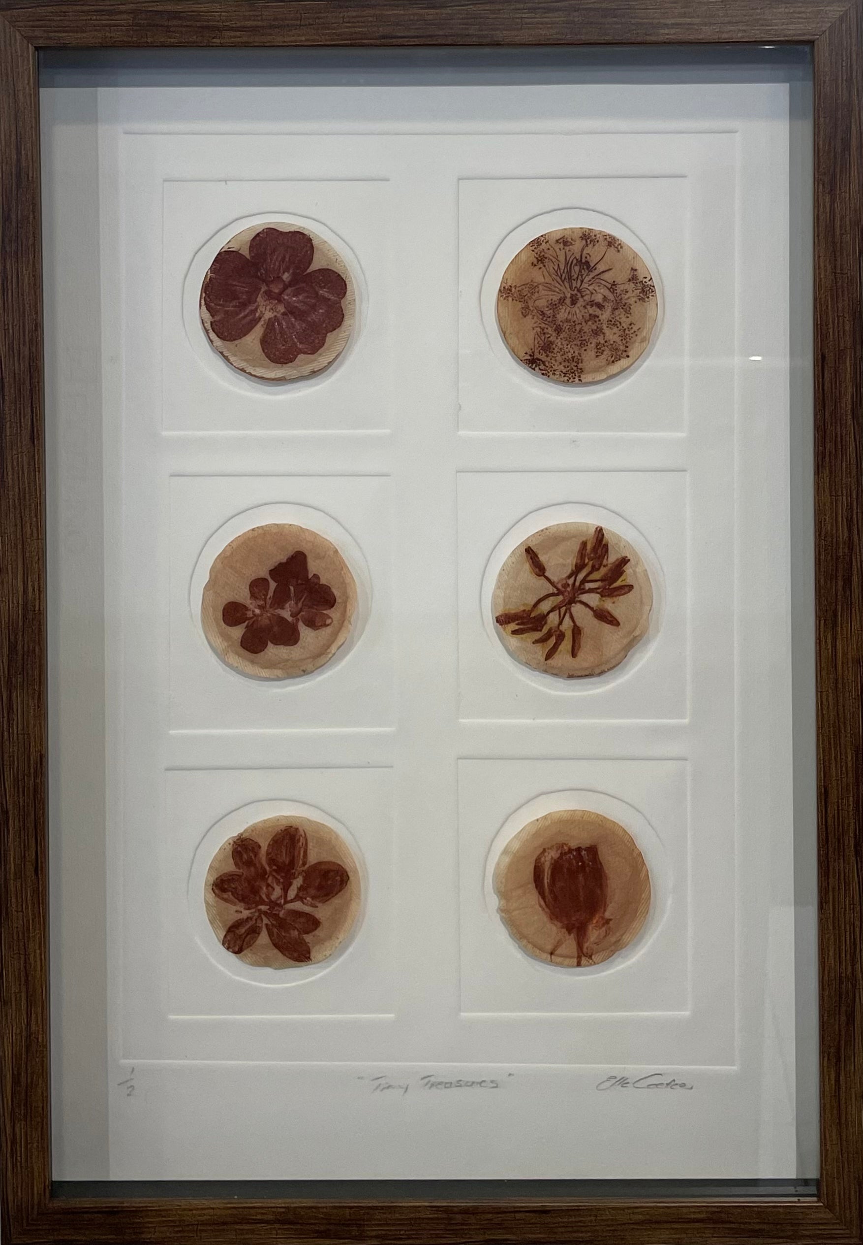 Discover the unique beauty of Tiny Treasures monoprints by Christelle Coetzer. Each print features handcrafted flowers on delicately mounted tea bags, creating a one-of-a-kind piece of art. The embossed paper adds another layer of texture to these charming treasures. Perfect for anyone looking to add a touch of nature to their home decor.